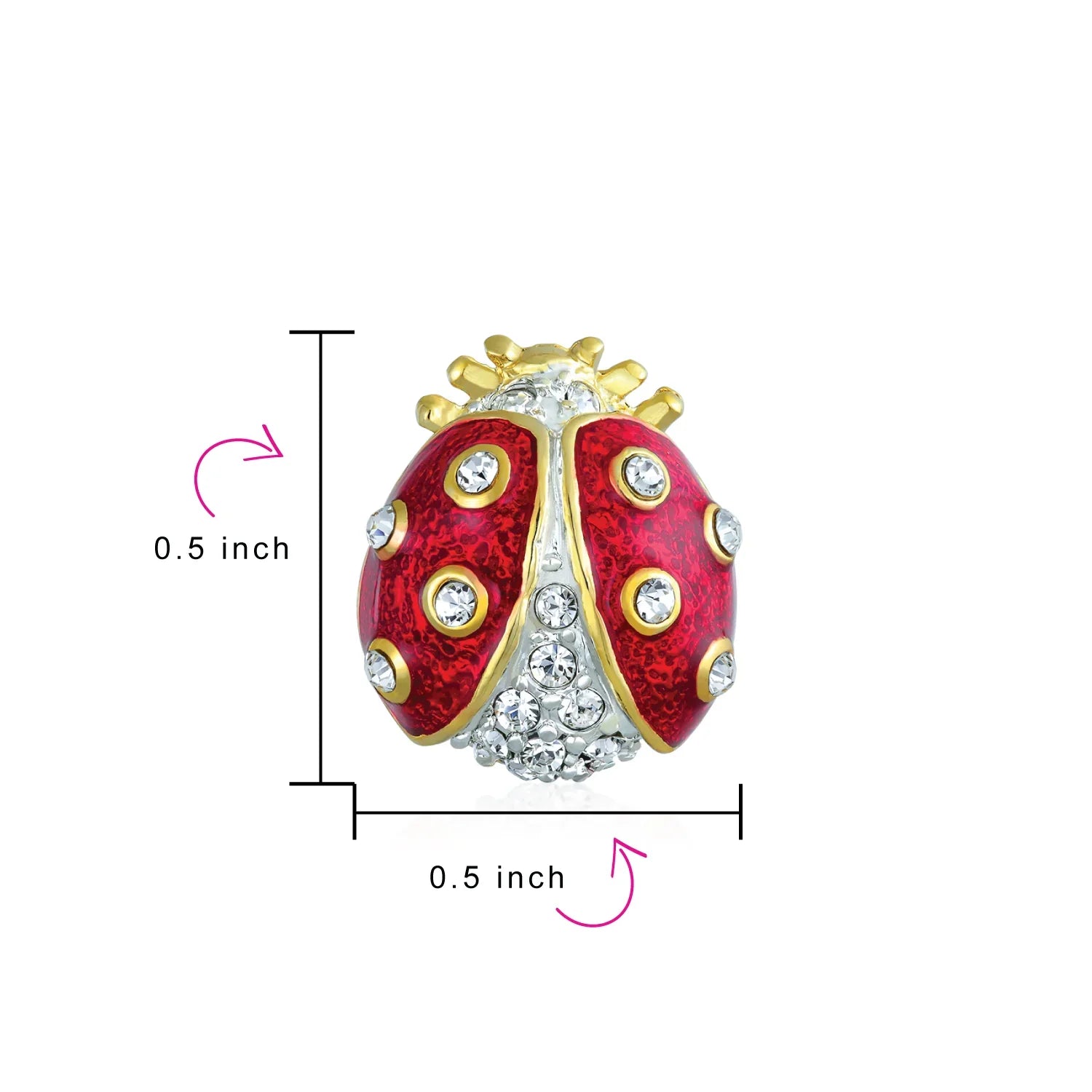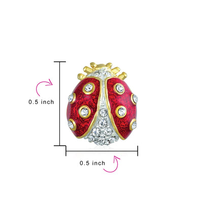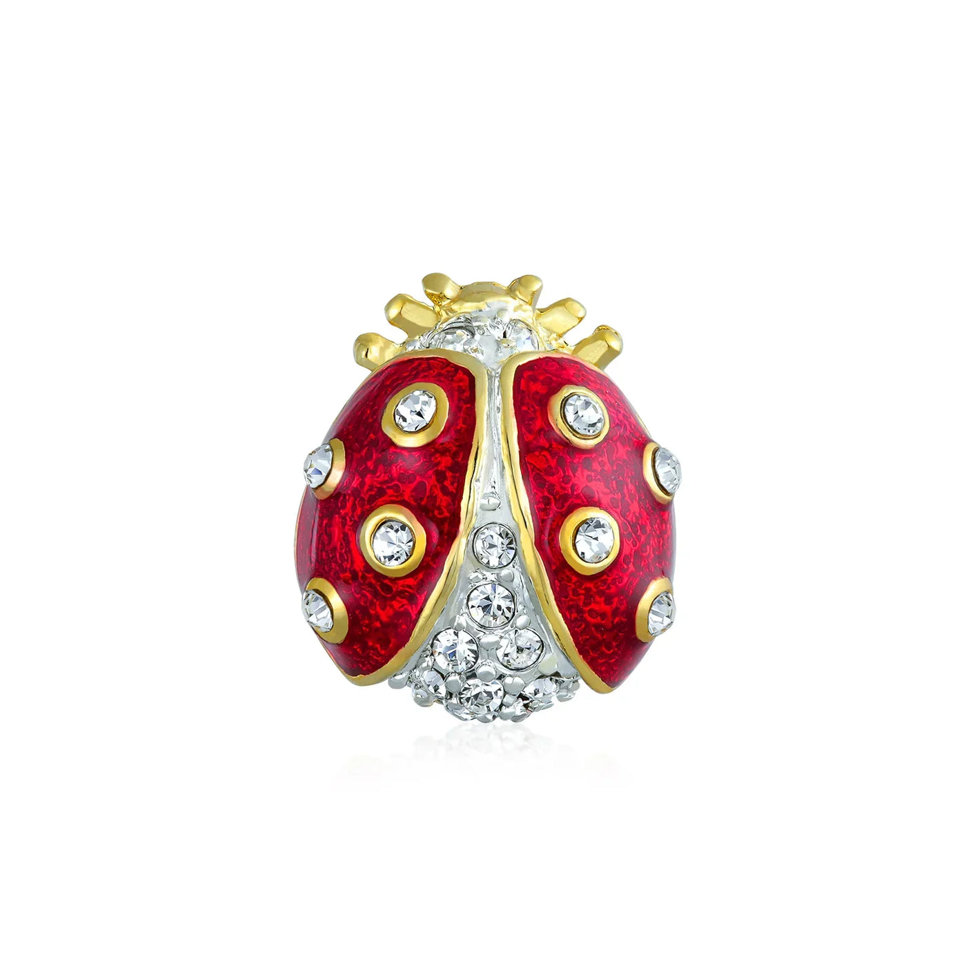 - Looking for good luck? This charming ladybug lapel Brooch Pin is perfect. Ladybugs symbolize luck and love. Gold plated with red enamel and clear crystal accents. This crystal ladybug pin doubles as a lapel pin. Perfectly accents any outfit. Made of quality materials. Add spring flair with this ladybug Brooch Pin today.