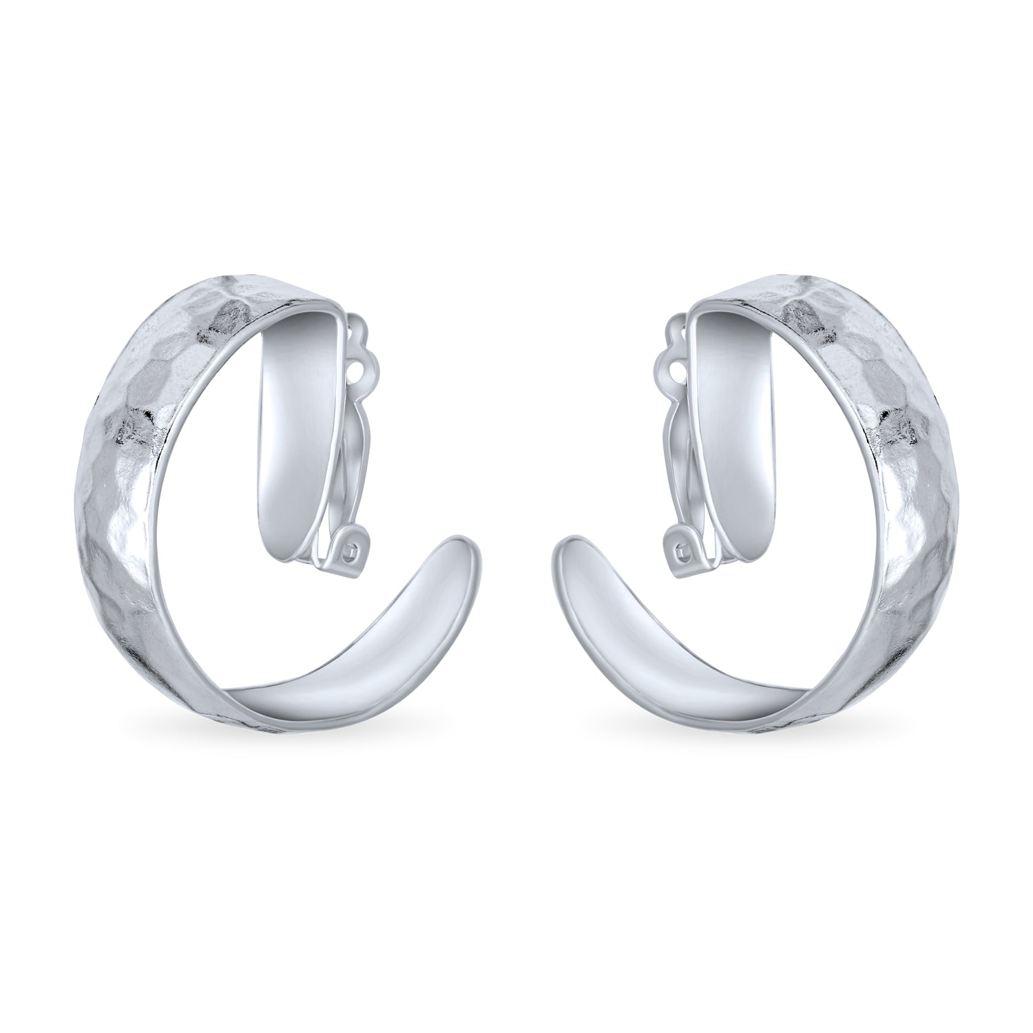 - Introducing grand sterling silver clip-on earrings with a hammered motif. These half hoop clip-ons are crafted from .925 sterling silver. The hammered finish adds a unique texture. Perfect for non-pierced ears, they offer a stylish half hoop design. Pair with our silver hammered jewelry collection. Versatile silver complements any wardrobe. Achieve the half hoop earring look effortlessly with these clip-ons.