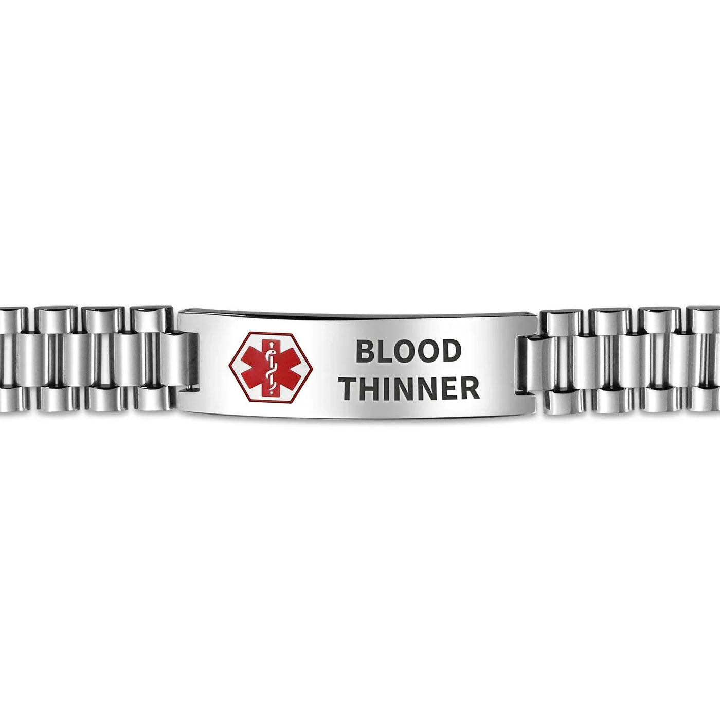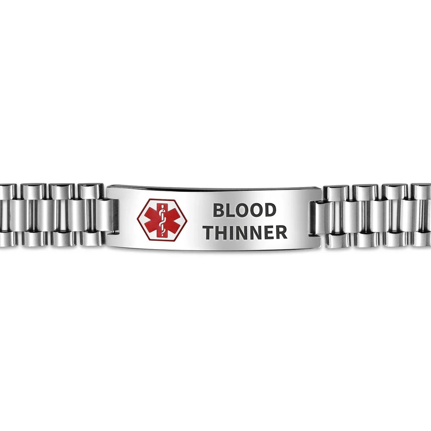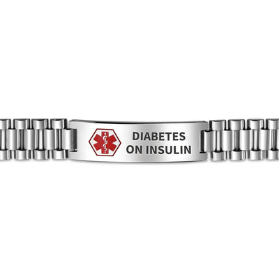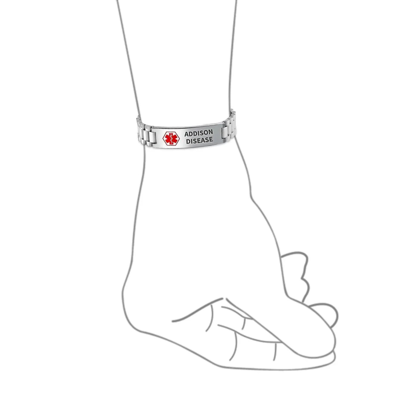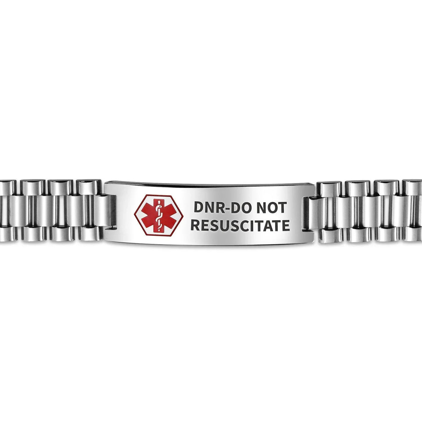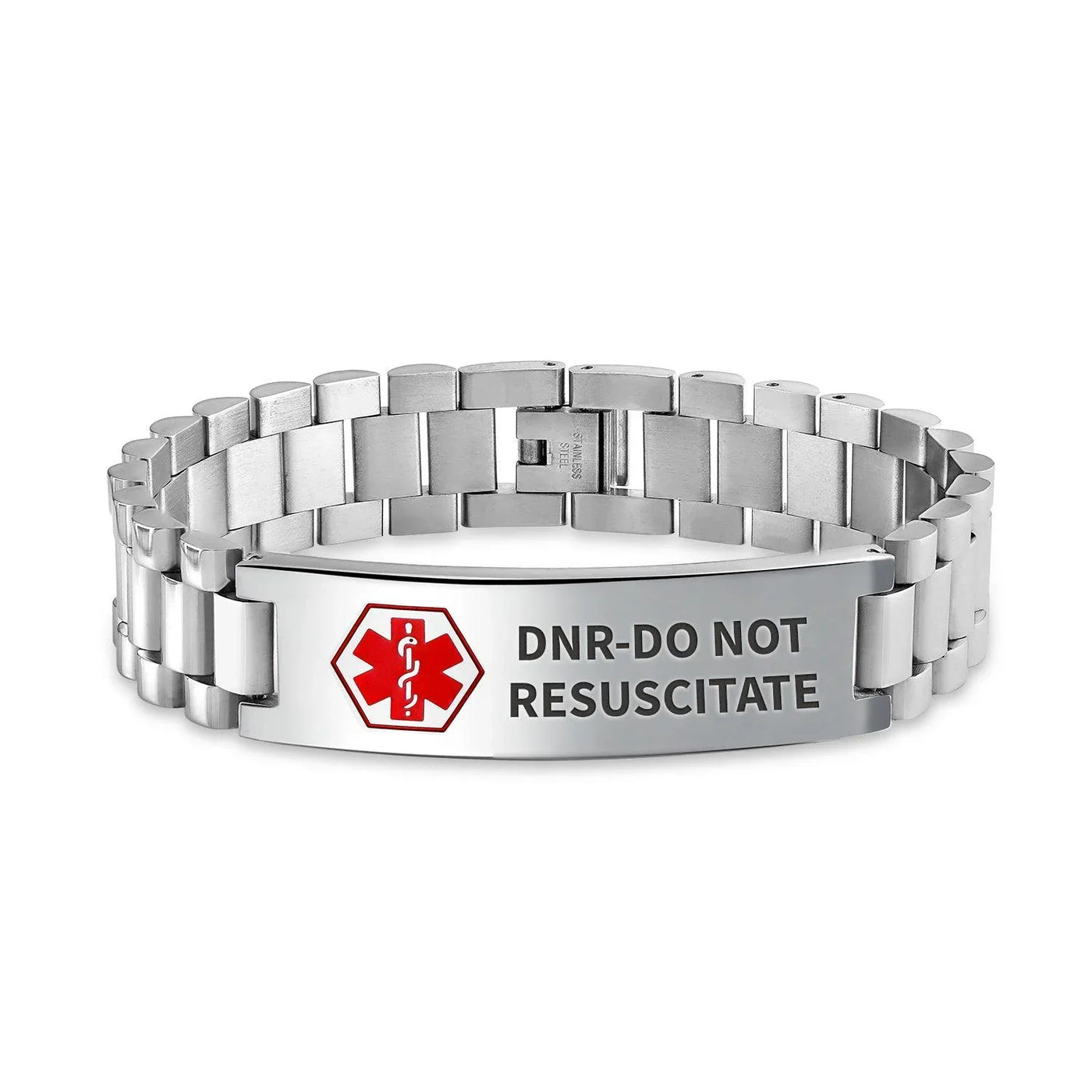 - Customize it or Pre-graved with Addison Disease, Blood Thinner, Diabetes On Insulin, DNR-Do Not Resuscitate, Epilepsy, Pacemaker, Penicillin, Type 1 Diabetes, Type 2 Diabetes identify mens bracelet in case of a medical emergency. Cuban link chain with a red caduceus the traditional symbol of medical id tag at quick glance.