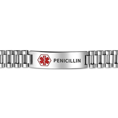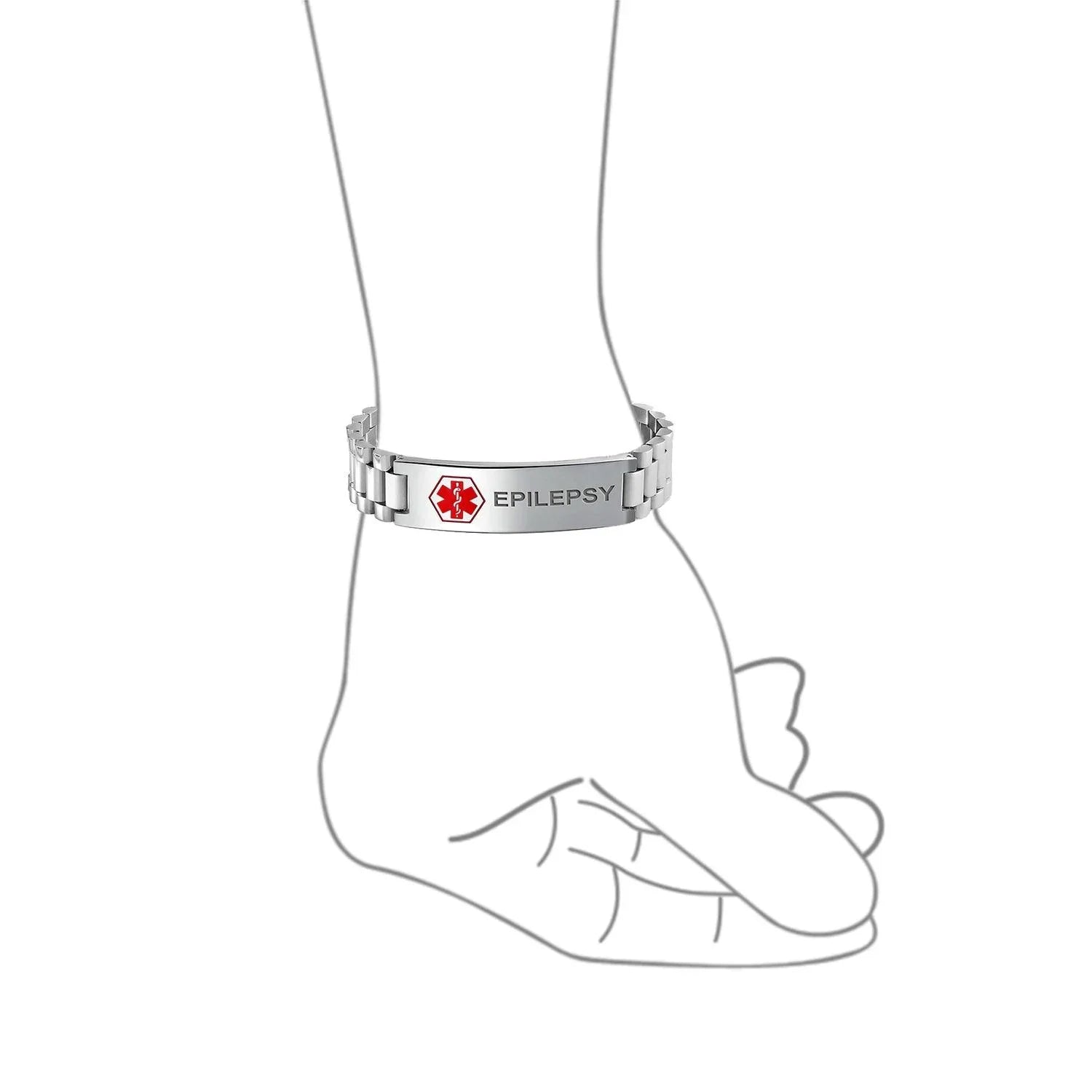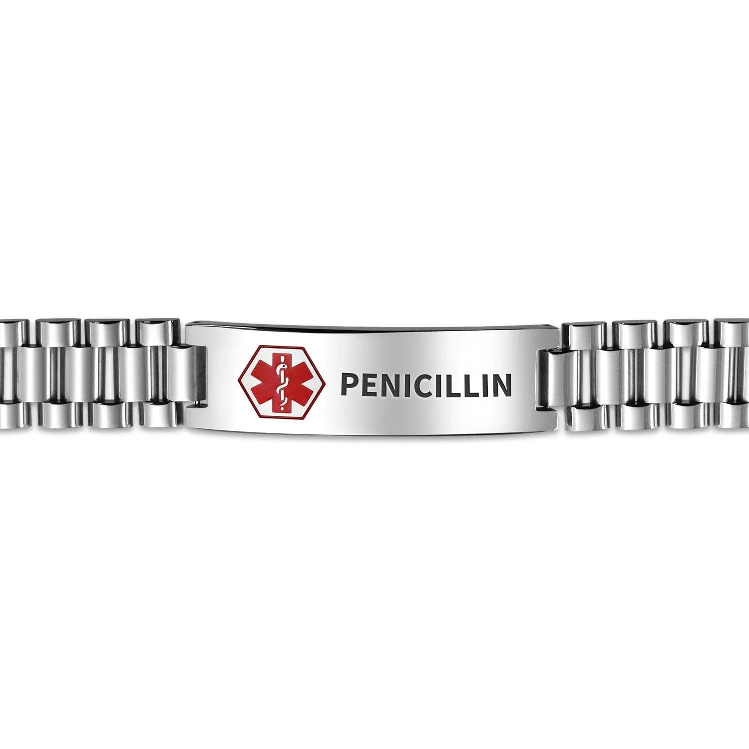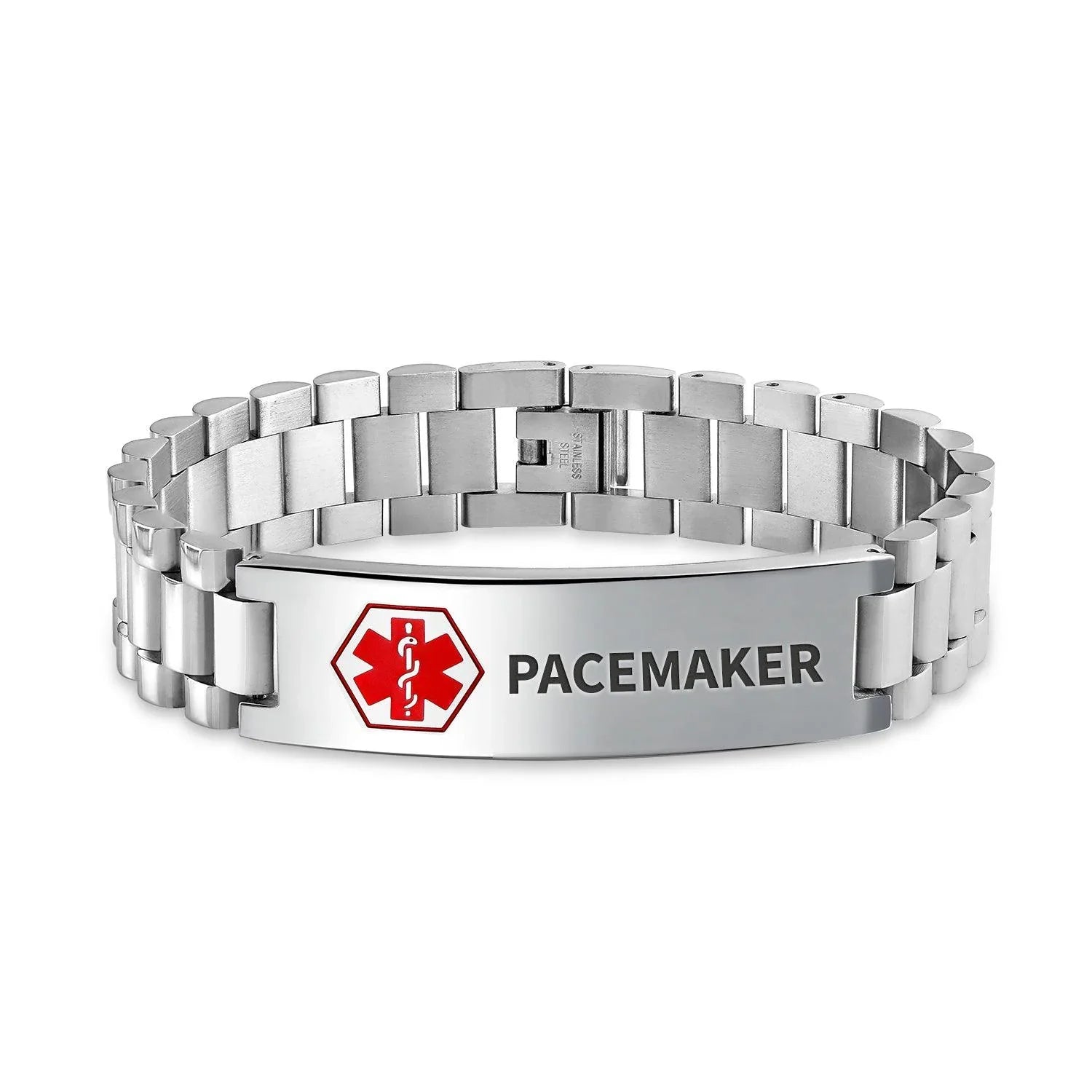 - Personalized custom engraved medical bracelet for men, made of durable, hypoallergenic stainless steel. Chic, rugged look with polished links. Features internationally recognized medical caduceus symbol. Engrave vital medical information or severe allergies. Fits up to 8.5-inch wrist, ID bar measures 2x0.35 inches. Secure fold-over clasp for active lifestyles. Stylish and practical Medical jewelry for men.