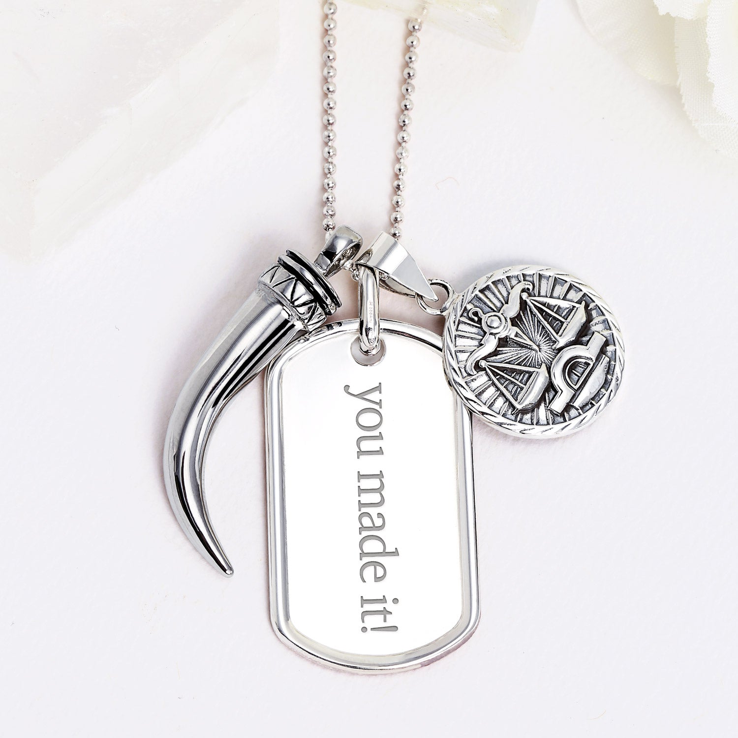 - This marvelous military dog tag pendant was forged out of sturdy and alluring .925 Sterling Silver and has an unforgettable polished finish design. The 1.5 inch long dog tag is completed with a chain making it into a memorable dog tags necklace that anyone can rock. Give this military dog tag pendant as a gift on any holiday to anyone of your dear friends or family members who has a love for wearing military necklace pendant necklaces and dog tag jewelry. This winsome dog tag pendant makes for the perfect gift for everyone's birthday, Christmas, or any other holiday.