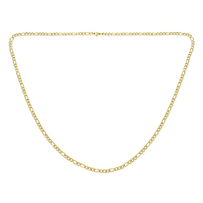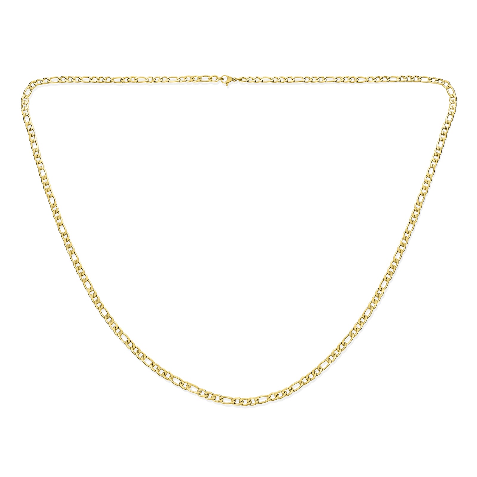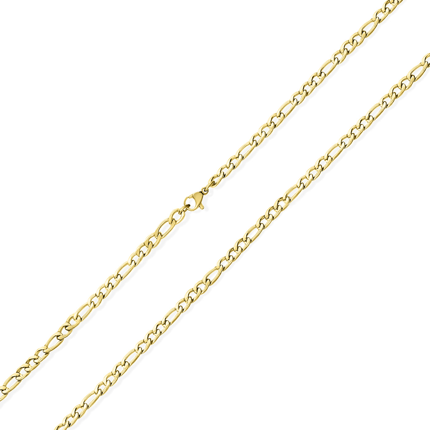 - This sleek Stainless Steel Figaro chain will make him feel like he has the Midas touch. Made from Stainless Steel, this men's neck chain has been gold plated using Ion plating technology, a state of the art plating technique that makes metals extremely resistant to abrasion. These men's gold chains have a lobster claw clasp that will keep this item secure even he you have a very active lifestyle. Stainless Steel jewelry is both durable and versatile and with its 4.5mm width, this Figaro link chain is ideal for any outfit. Gold chain necklaces have a classic appeal, and with their unisex style, these Stainless Steel chains are perfect for anyone on your gift lists.