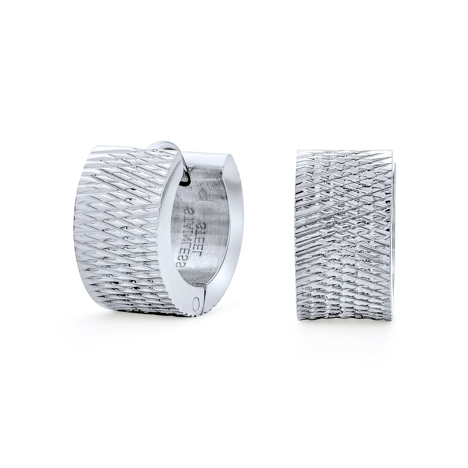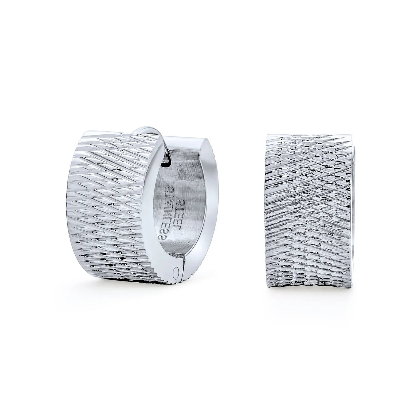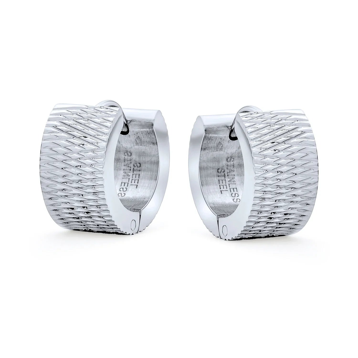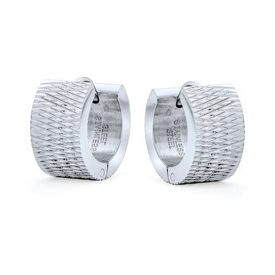 - Introducing our chic stainless steel mesh huggie hoop earrings, a must-have for your jewelry collection. Crafted with precision, these silver-toned hoops offer a stunning sheen. The unique mesh pattern exudes a hip Art Deco or minimalist modern vibe. Versatile for any occasion, these earrings elevate your look effortlessly. Enjoy elegance and a cool, clean aesthetic synonymous with stainless steel jewelry. These affordable mesh hoops add pizazz without breaking the bank. Perfect for treating yourself or as a stylish gift.