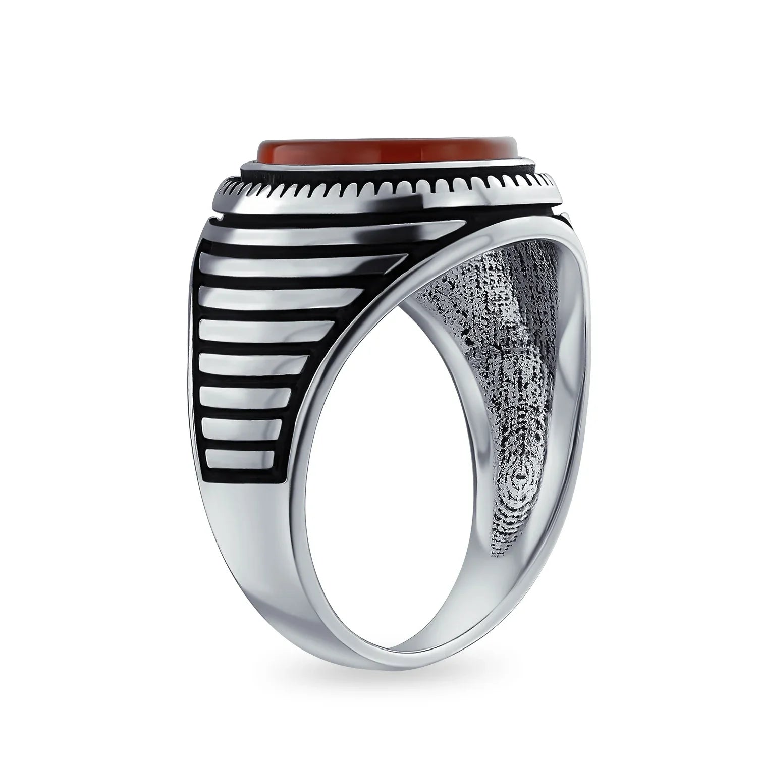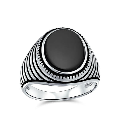 Mens Retro Stripe Gemstone Statement Oval Onyx Signet Ring Silver
