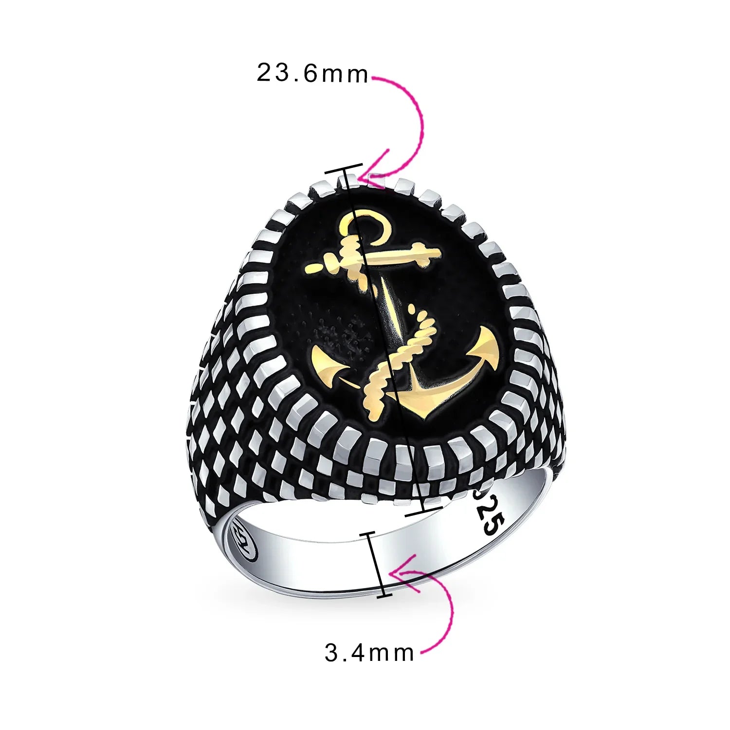 - A bold checkerboard surrounds the center anchor and extends along shank of the wide ring complimenting the anchor and the combination finish ring
