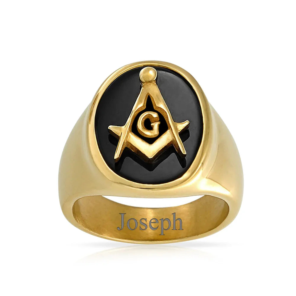 • ELEGANT DESIGN - Proudly showcase your brotherhood with this stunning men's Masonic ring, featuring a captivating two-tone design with simulated onyx resin set against gleaming gold-plated stainless steel. Available in size 7.