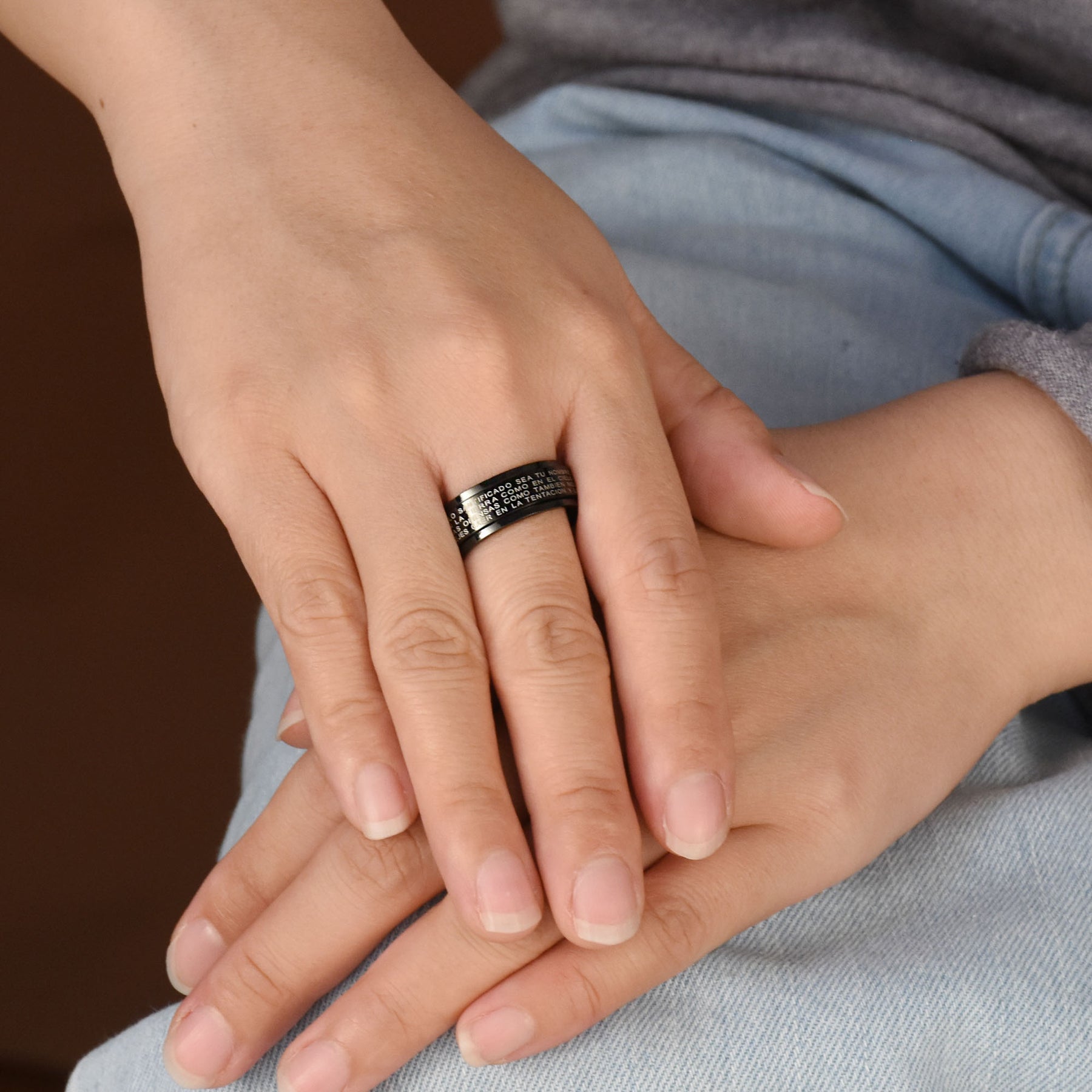 - Our religious jewelry holy cross Lords Prayer ring in Spanish, spins the classic script on the outer band for a modern look with a smooth feel. These stylish black stainless steel rings for men make perfect religious gifts for keeping their faith close at hand. Makes great Fathers Day gifts.