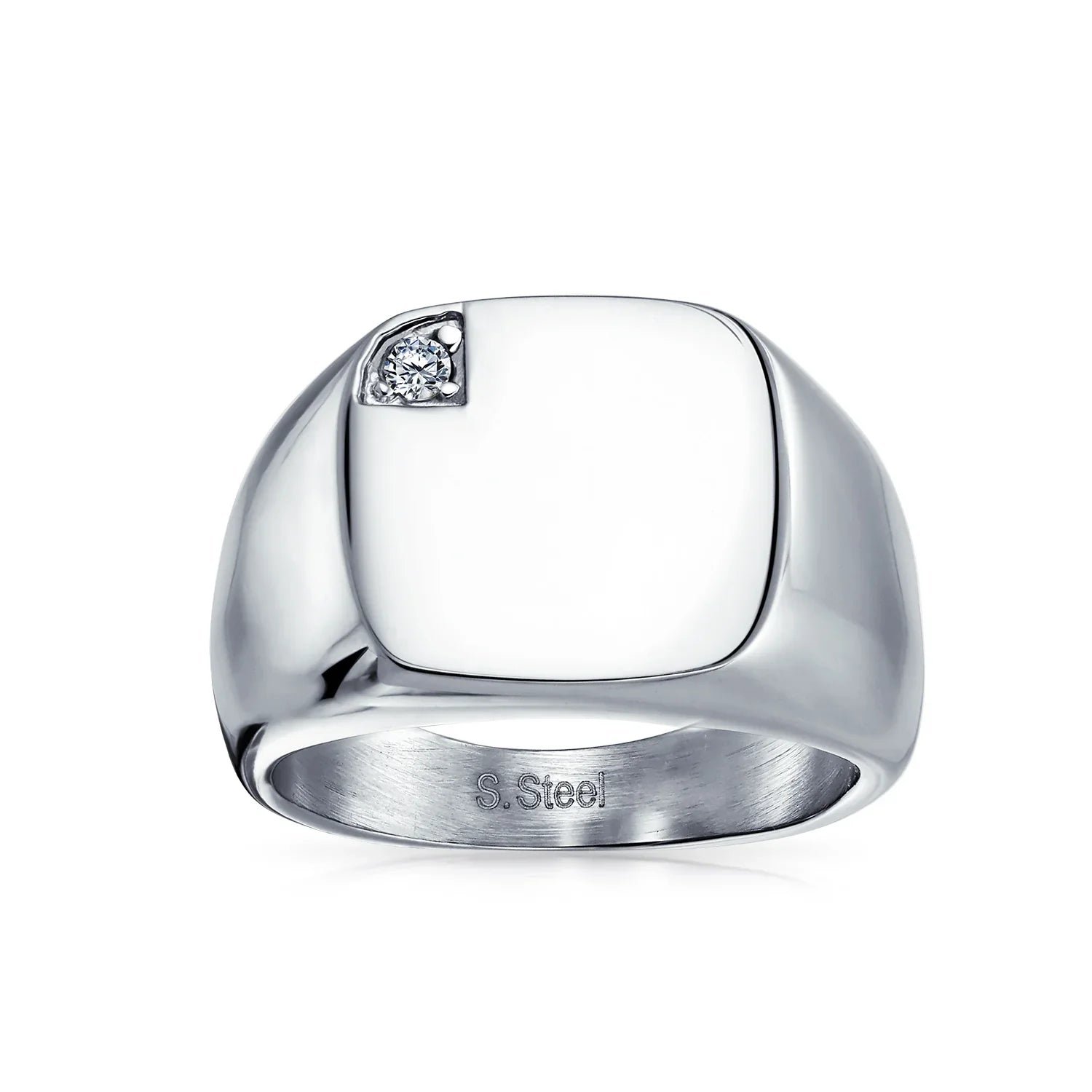 - Discover our latest men's square ring, impeccably smooth and polished. This Stainless Steel Ring for men features a timeless design. The square face with rounded edges adds sophistication. A small, sparkling clear CZ stone enhances its elegance. Perfect for Father's Day or a recent grad. Versatile and classic, it's a must-have accessory. Elevate your style with this timeless piece. Order now and stand out effortlessly.