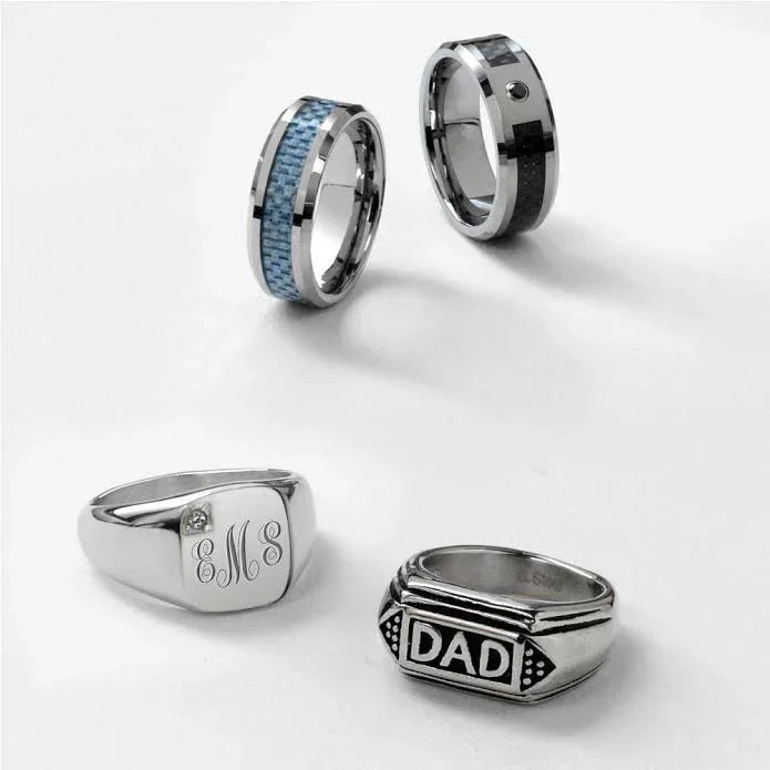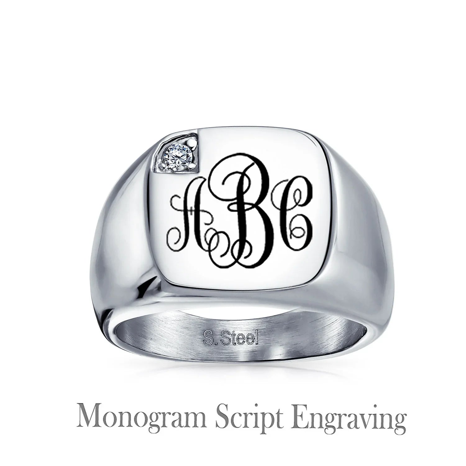 - The large monogram face of the ring boasts a sleek square shape with subtly rounded edges, exuding an air of sophistication. Adding to its allure, one corner is adorned with a dazzling clear CZ stone, imparting a tasteful shimmer that will make your favorite guy truly stand out, whether its during the day or a night out.