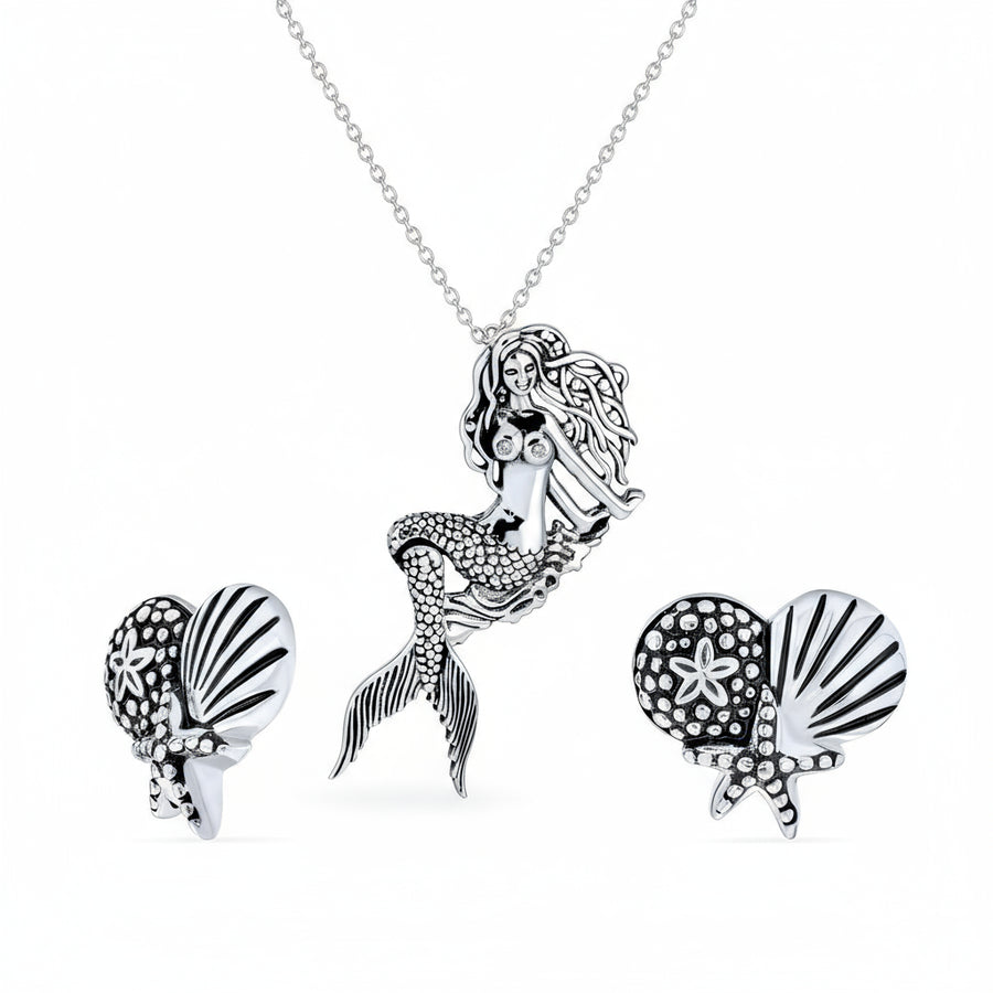 - Bring the beauty of the sea to your jewelry collection with this enchanting nautical set, featuring a detailed oxidized .925 sterling silver mermaid pendant necklace and coordinating sanddollar, starfish, and seashell stud earrings. The mermaid pendant showcases intricate Celtic-inspired detailing and a moveable tail, capturing the graceful spirit of the mythical sea maiden. Complementing the necklace, the earrings feature delicate coastal designs, adding a touch of tropical charm and seaside elegance. Perfect for women and teens, this versatile set is ideal for beach outings, everyday wear, or gifting to ocean lovers who appreciate whimsical and stylish sterling silver jewelry.