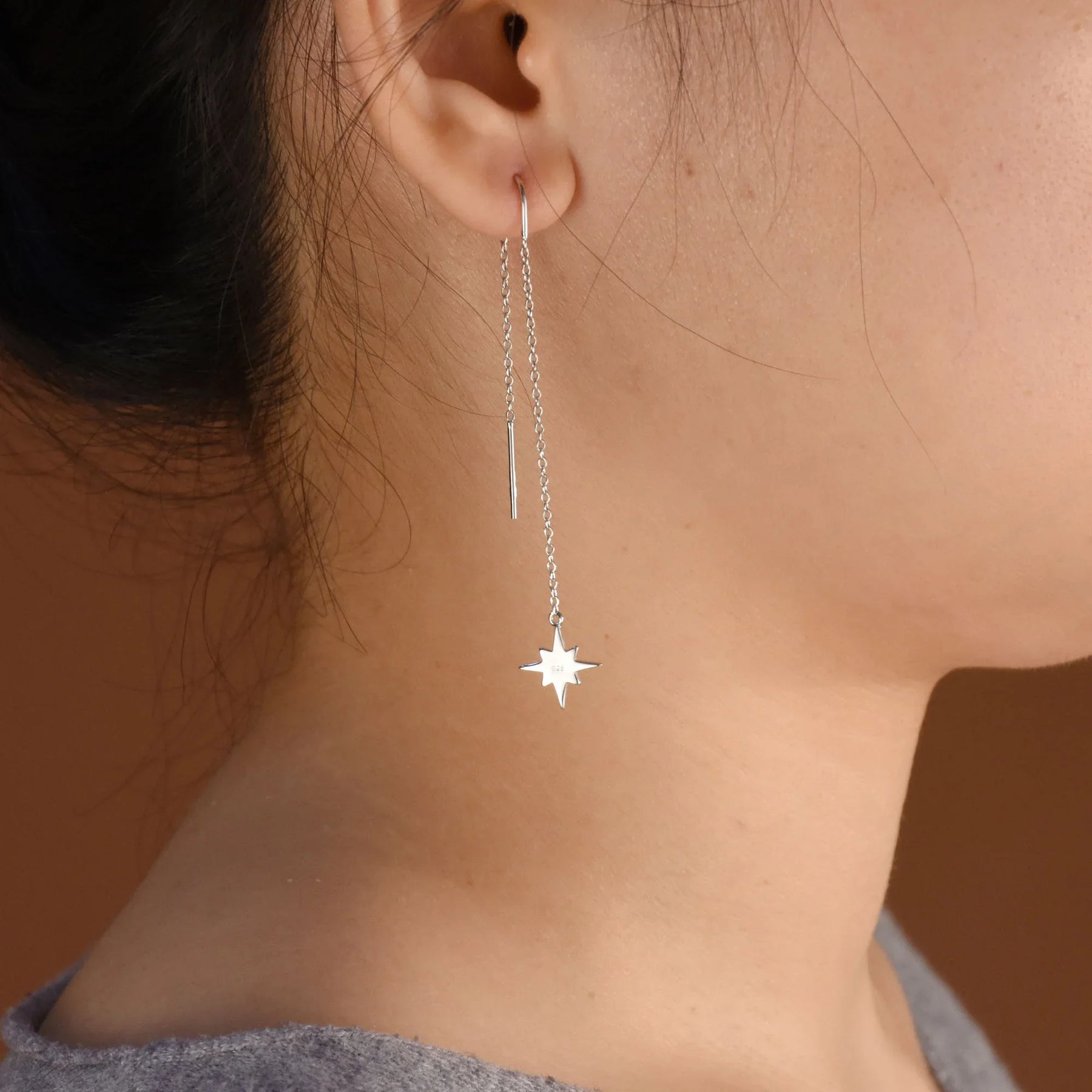 - Elevate your style with sterling silver Threader earrings. A tiny star dAngles from a two-inch rolo chain, exuding modern elegance. Perfect for channeling your inner diva. Ideal gift for yourself or fashion-forward friends.