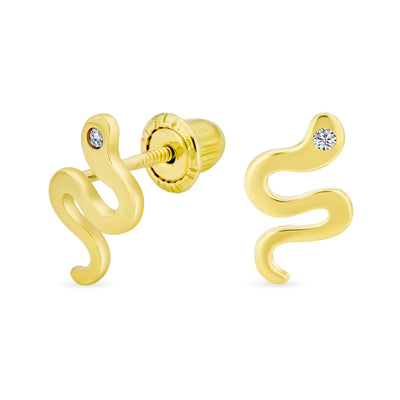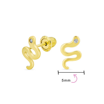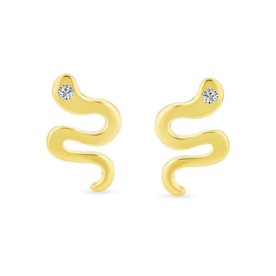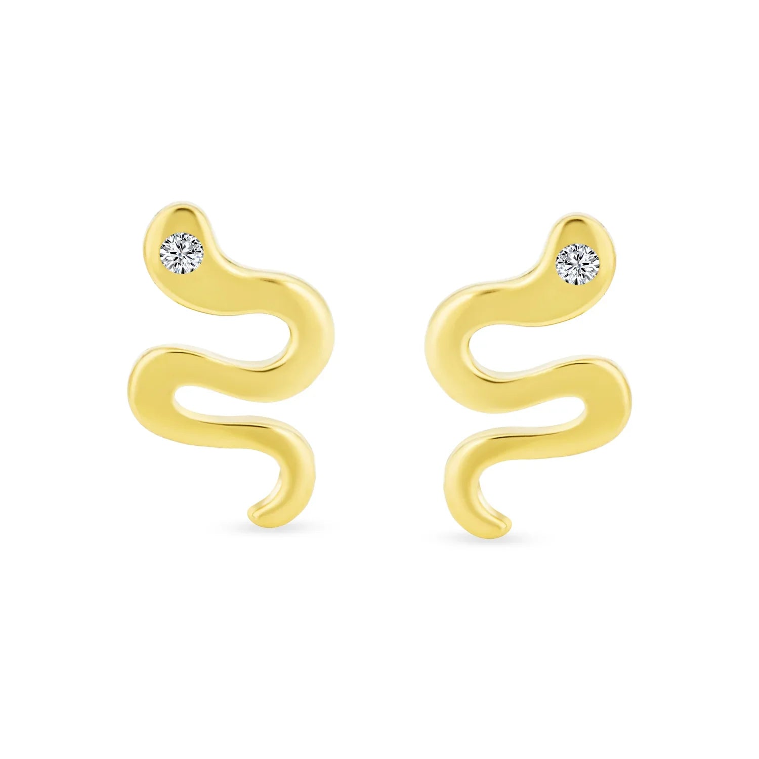 Minimalist CZ Stud Earrings: Tiny Serpent Snake Design in 14K Yellow Gold - Bling Jewelry