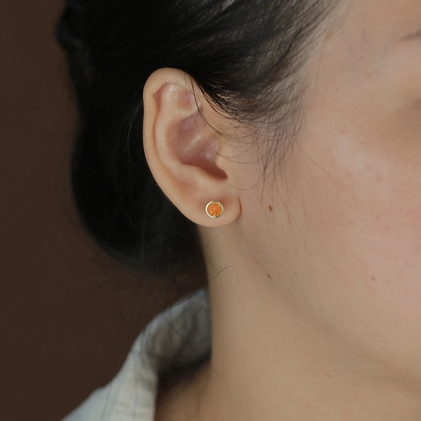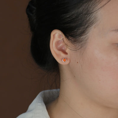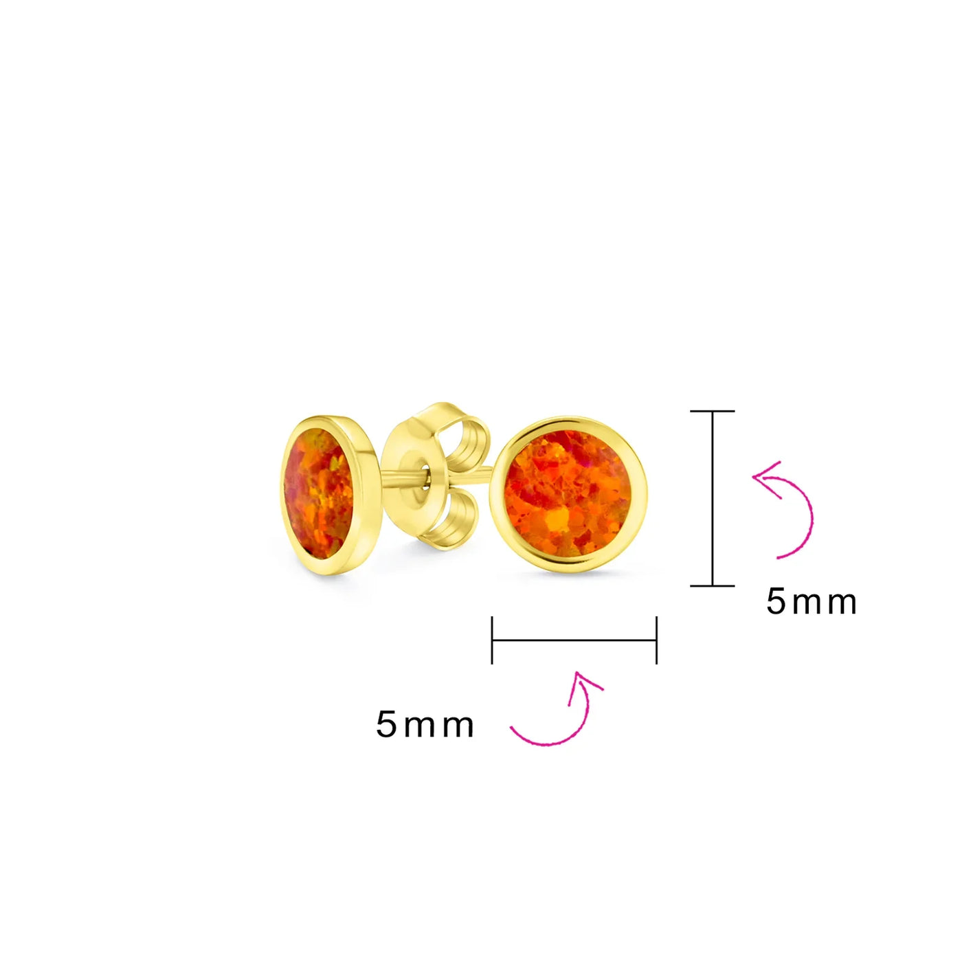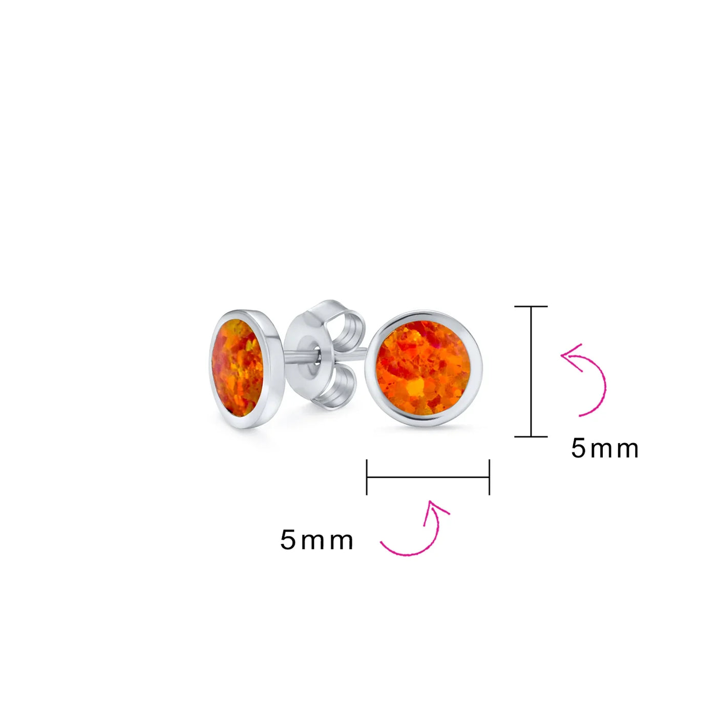 - Enhance your wardrobe with a vibrant touch of orange through these flat round bezel set stud earrings, featuring a 5mm simulated Mexican fire opal, ideal for pierced ears and perfect for October birthdays.