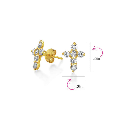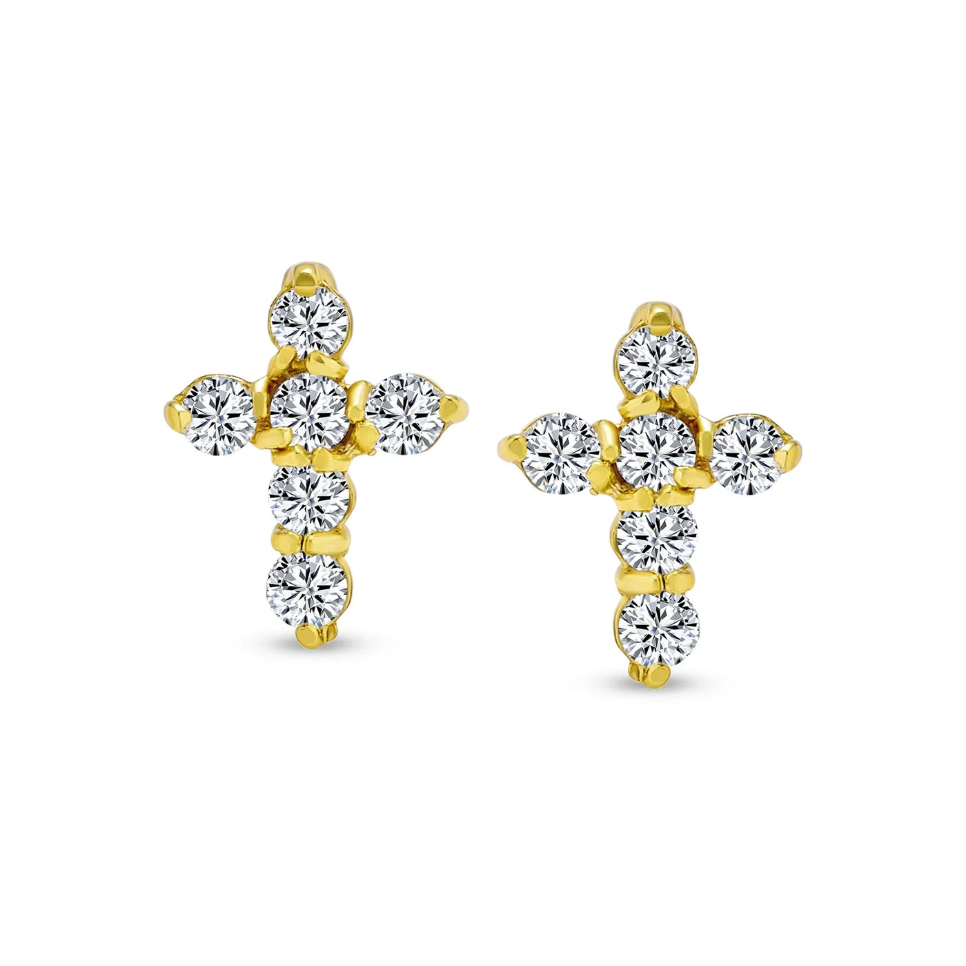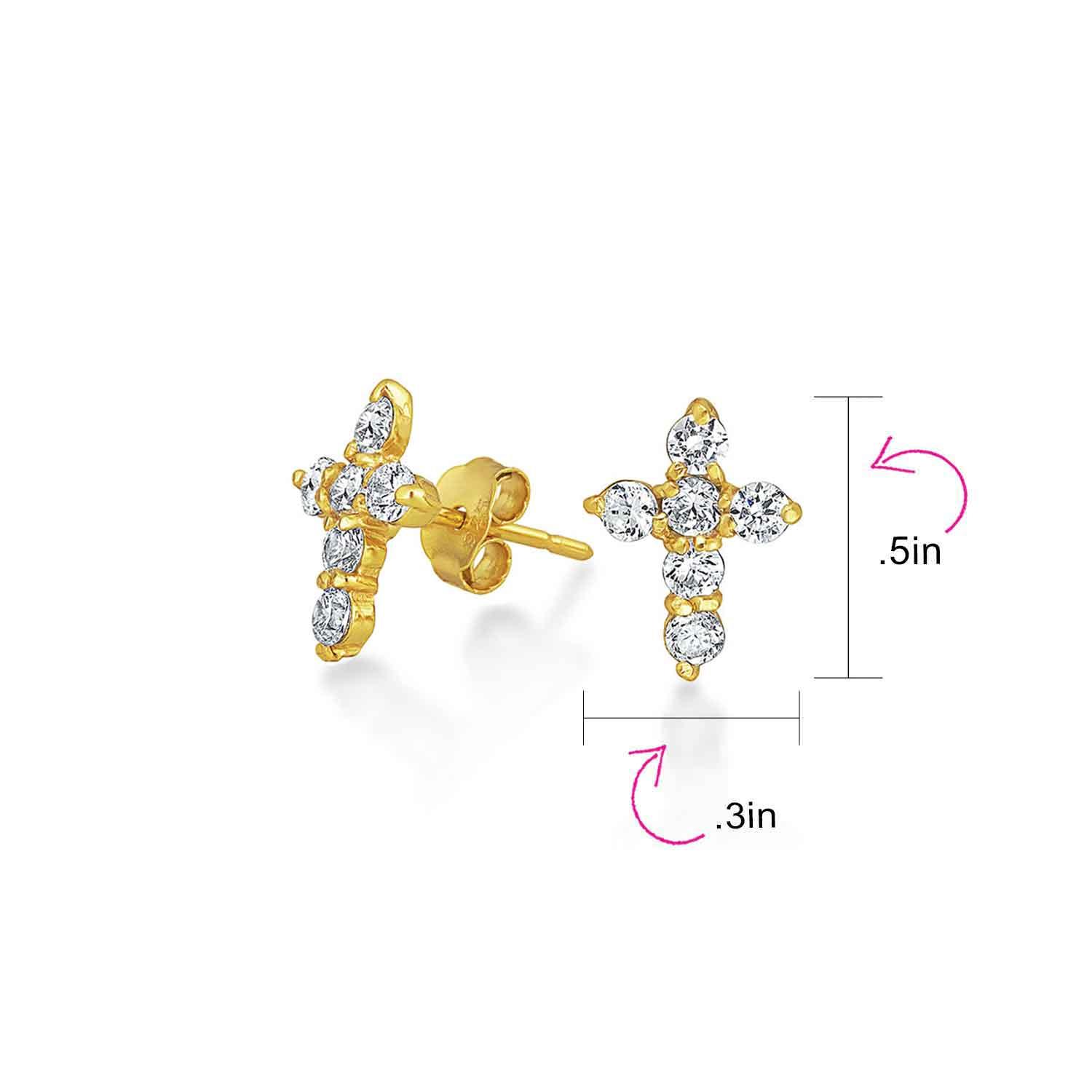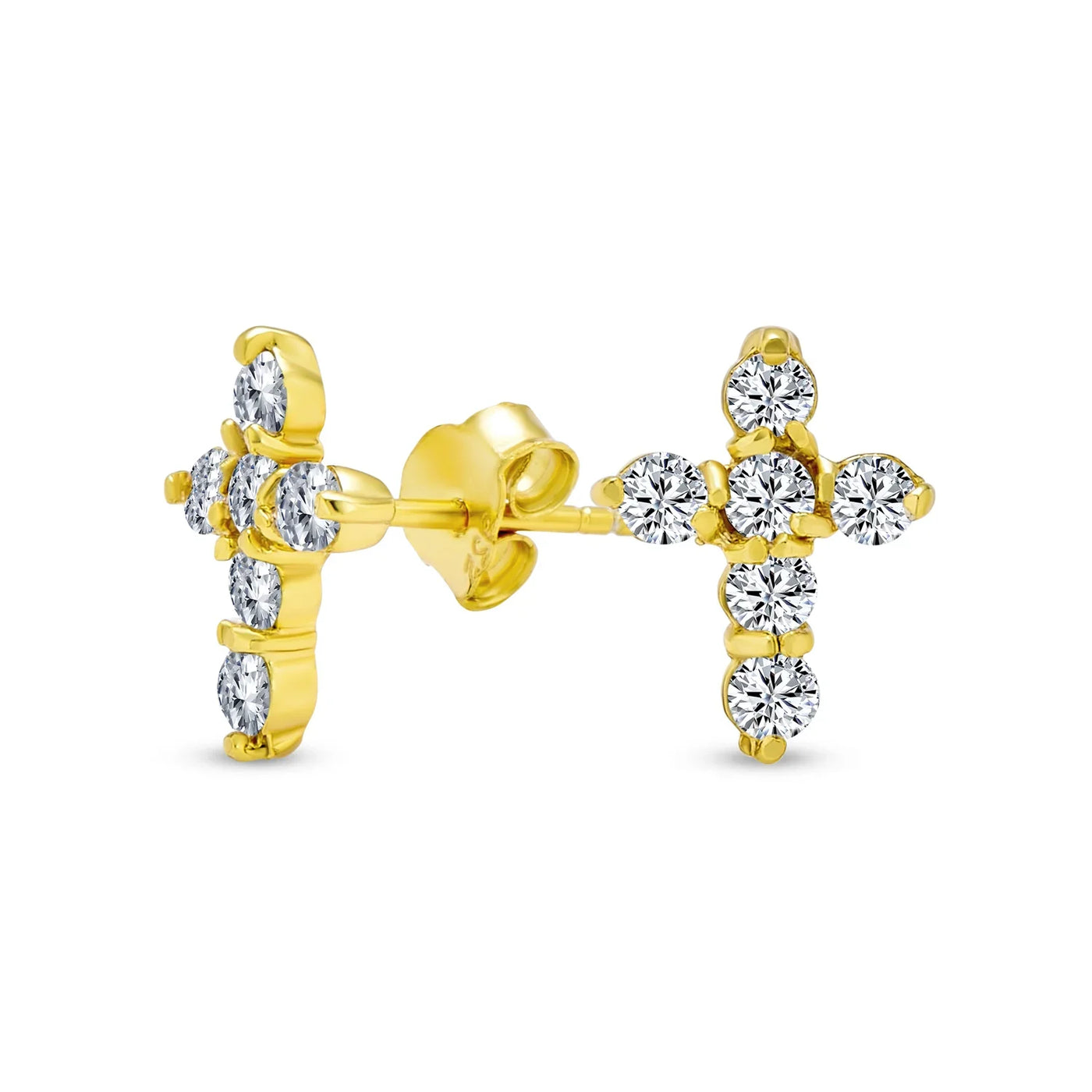 - Your devotion is Gold Tone in our sterling silver cross stud earrings. Featuring delicate cubic zirconia stones, these 14K yellow gold plated silver cross earrings are perfect for your religious gathering. Wear your religious jewelry everywhere you go. They also make great religious gifts for women.