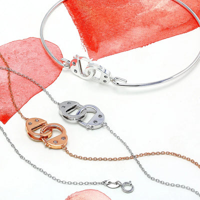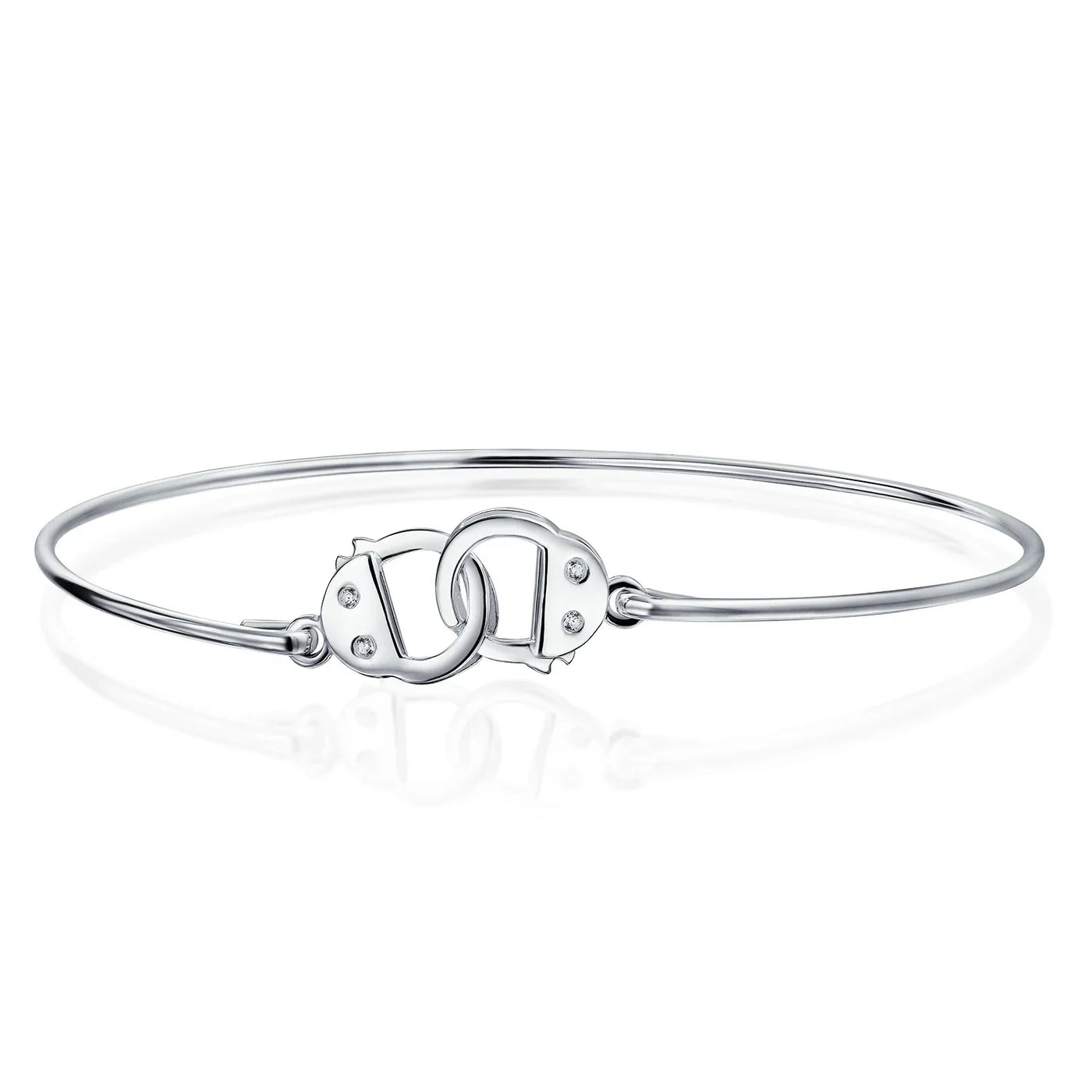 - This daring sterling silver bangle features naughty handcuffs with sparkling CZ stones. Perfect for stacking with other bracelets. Order now!