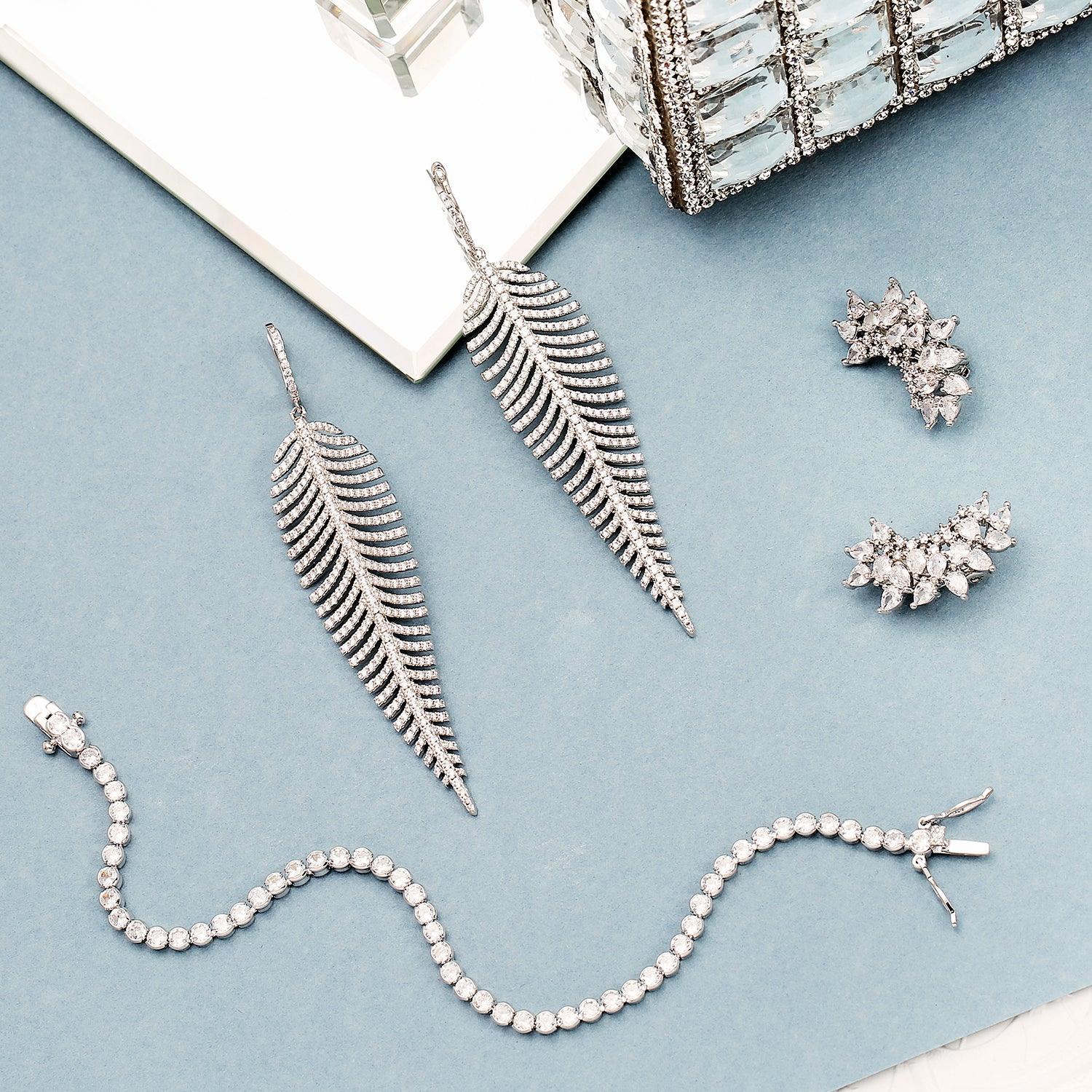 - Enhance your wedding day look with these stunning long bridal drop earrings featuring a dazzling pave cz Nature leaf design in a chandelier shape. Perfect for adding a touch of mesmerizing radiance to any special occasion.