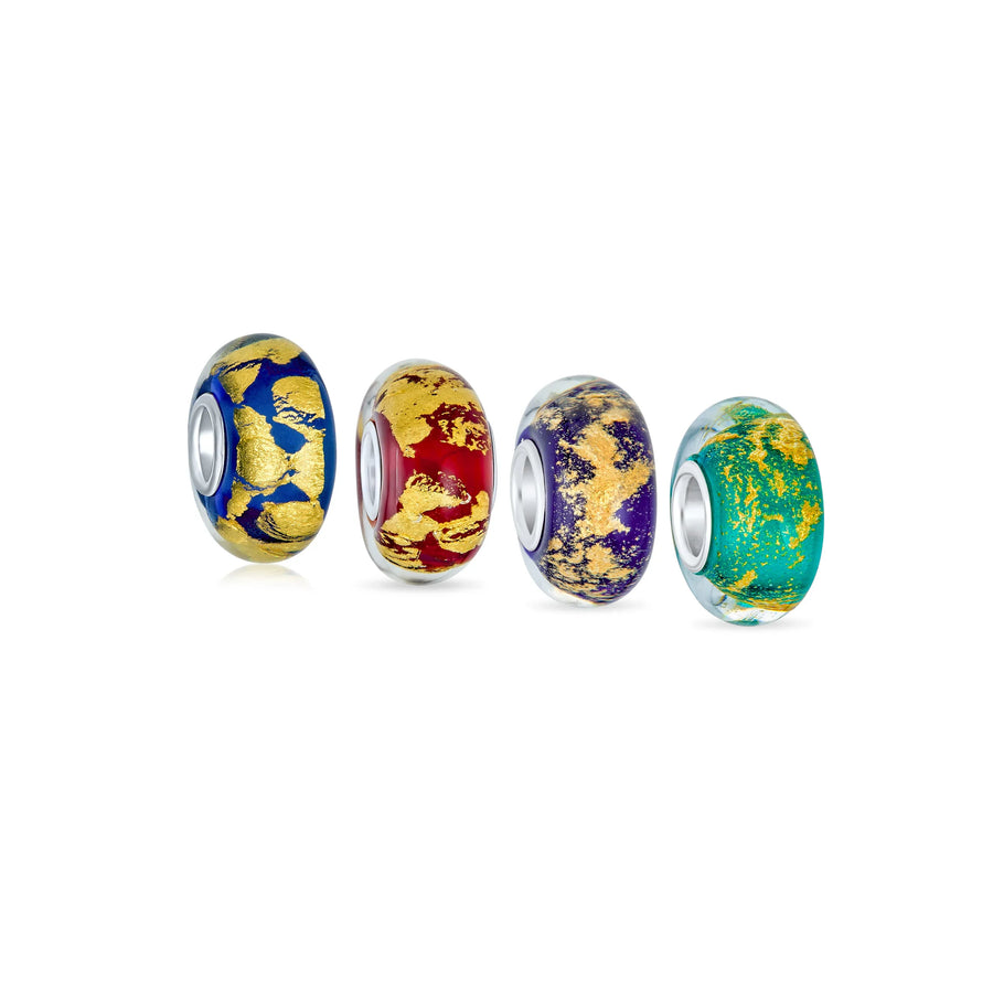- Gold flaking gives these Murano glass charm beads a luxurious touch. Add sparkle to your charm bracelet elegantly. Featuring a smooth .925 sterling silver core, they fit any 3mm snake chain, cord, or European bead bracelet.