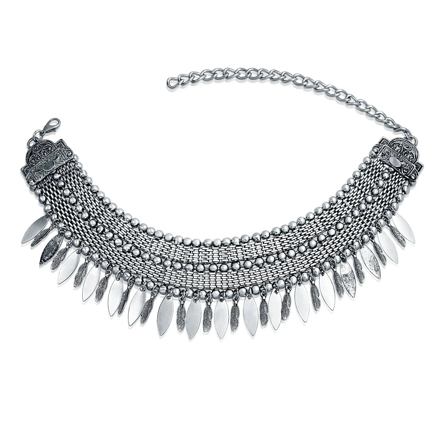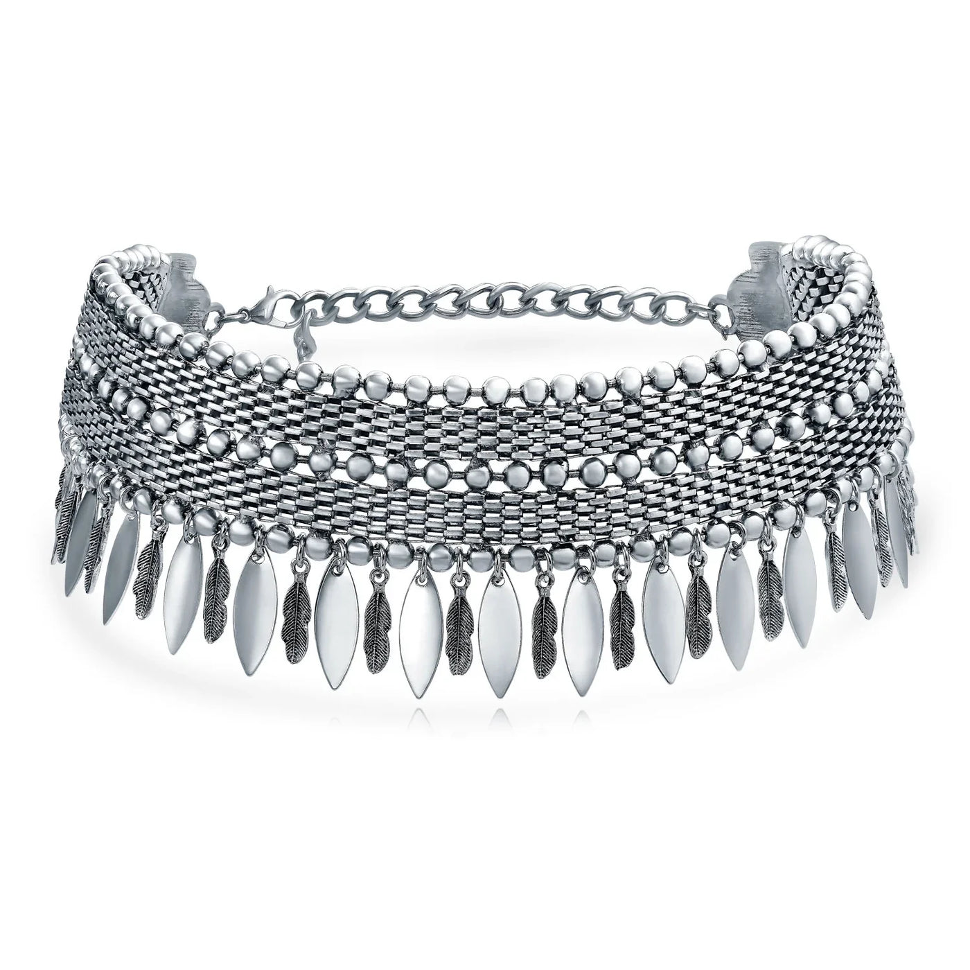 - Make a bold statement with our rhodium-plated dangling feathers choker. Features alternating bead and weave chains with metal feathers. Adjustable 5.5in extender fits most. Perfect with a vintage tee, jeans, or a little black dress.