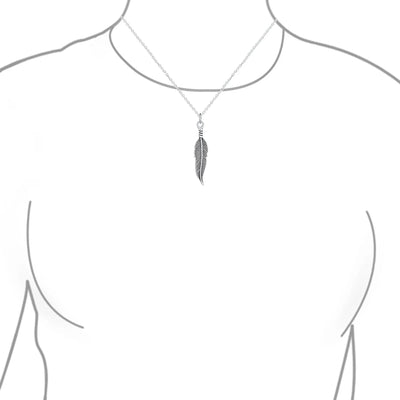 - Float like a feather with this 16"chain, two toned necklace. This pendant is an elegant addition to any outfit or layering of necklaces. This oxidized sterling silver feather has an antique look and a light weight feel, so its favorable and versatile.
