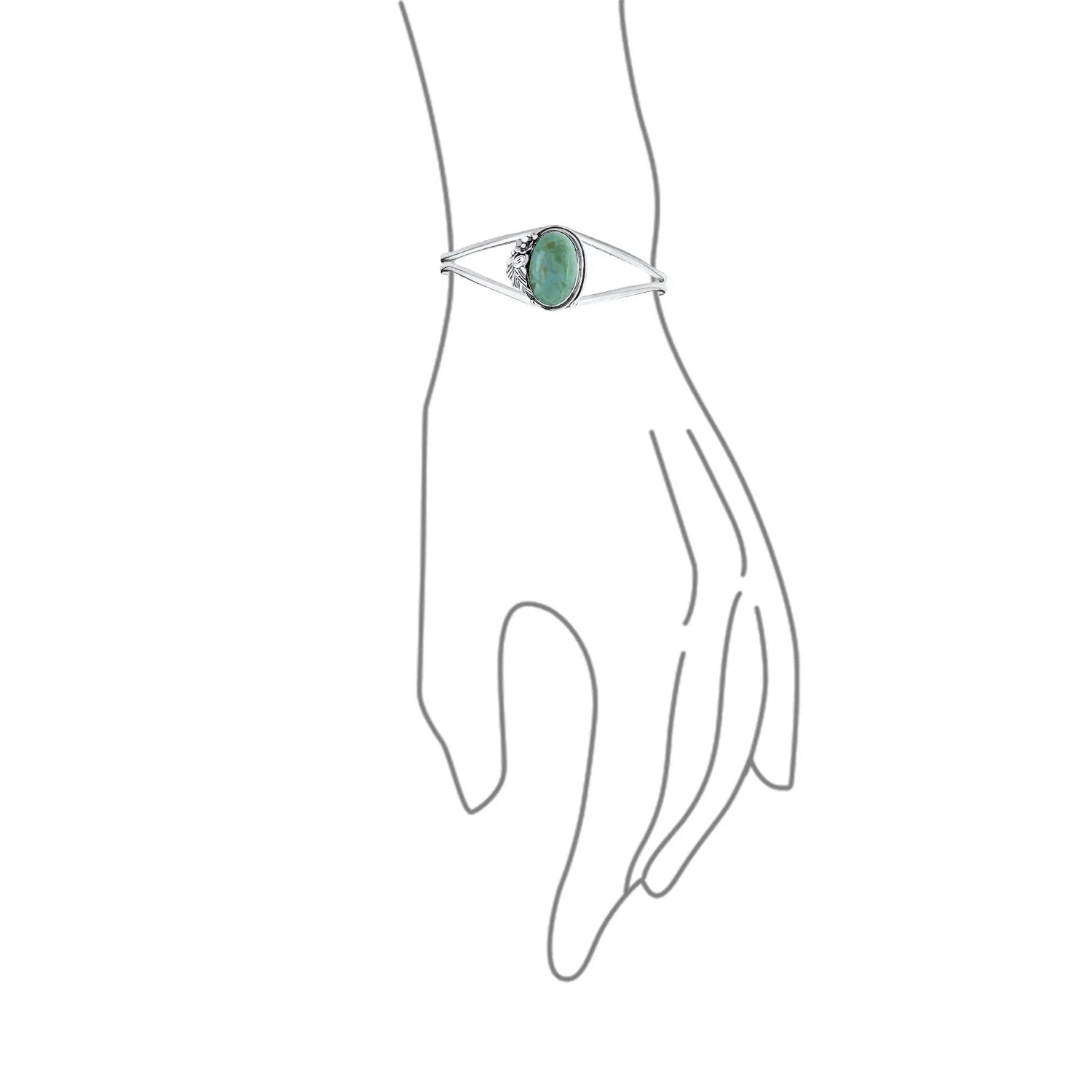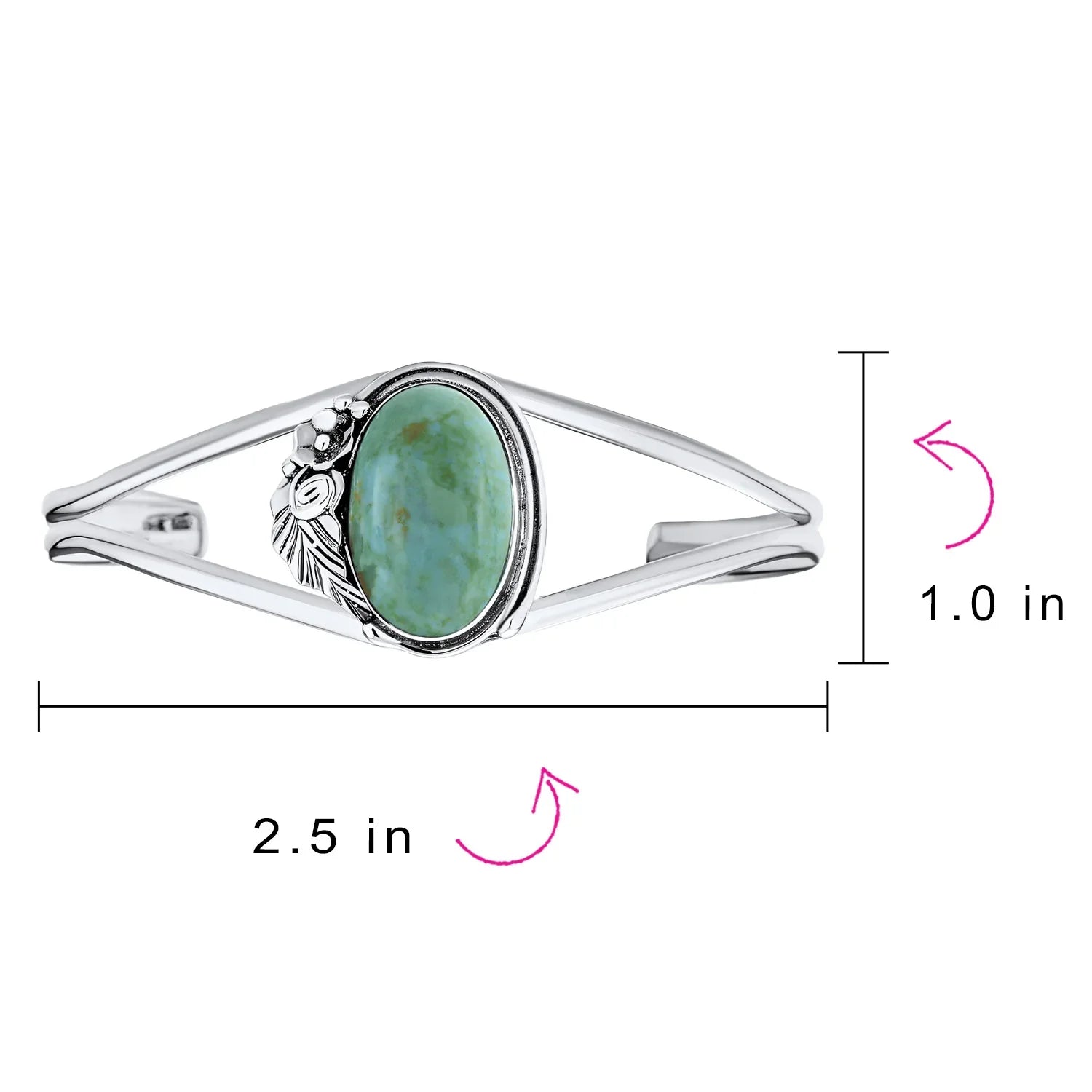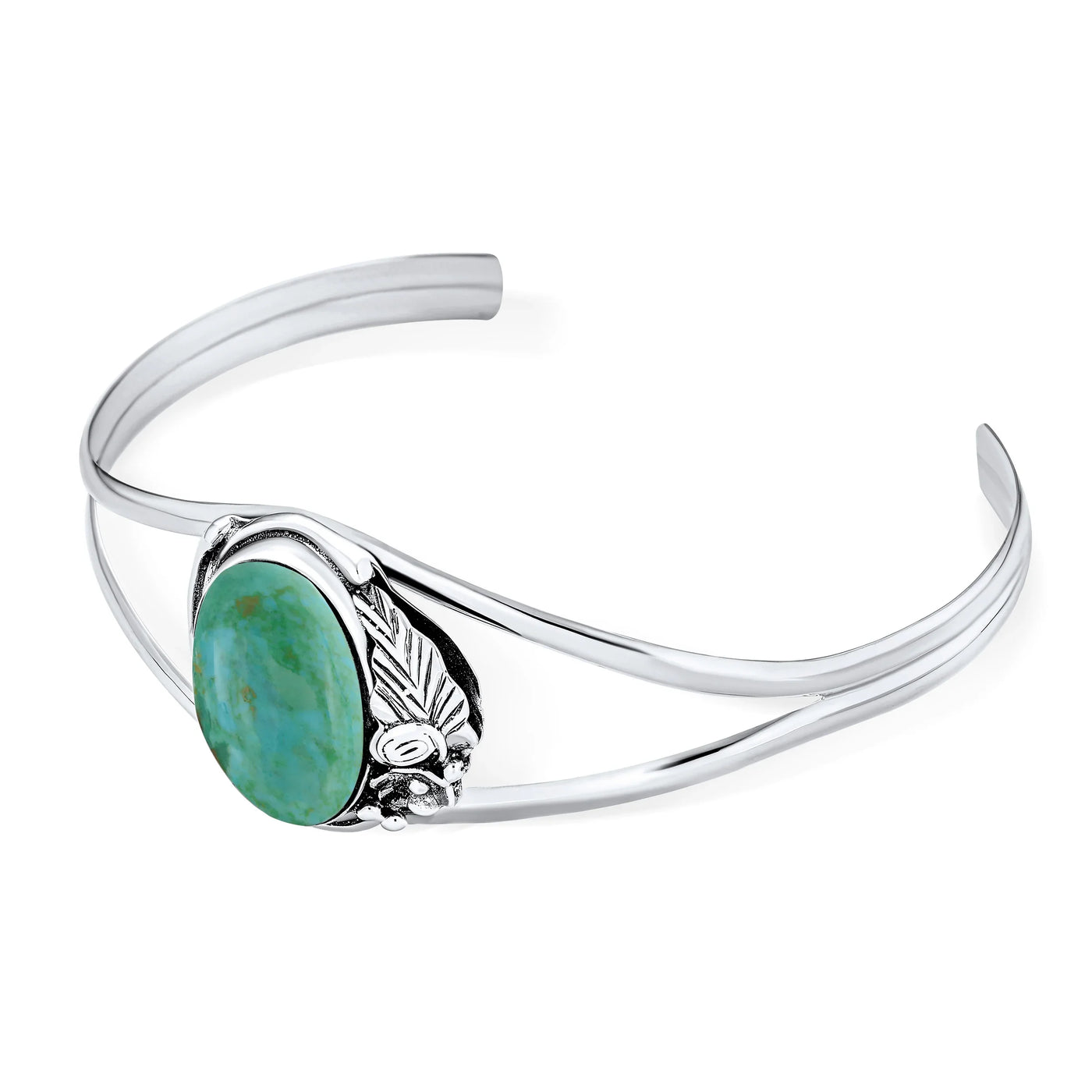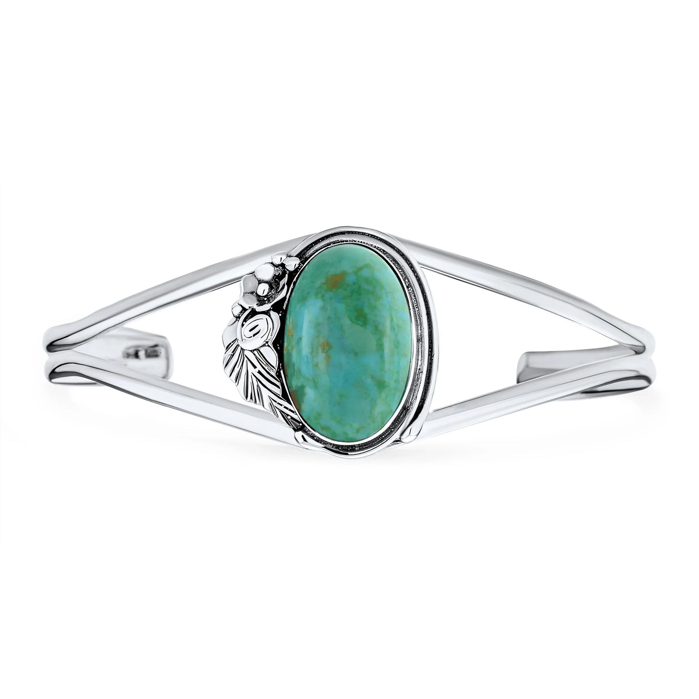- Retro Stabilized Turquoise jewelry is timeless. This southwest bangle features a Turquoise cabochon with floral accents. Sterling silver bracelet perfect for any wardrobe.