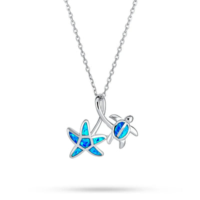 Nautical Blue Opal Sea Turtle Starfish Pendant Necklace in Sterling Silver