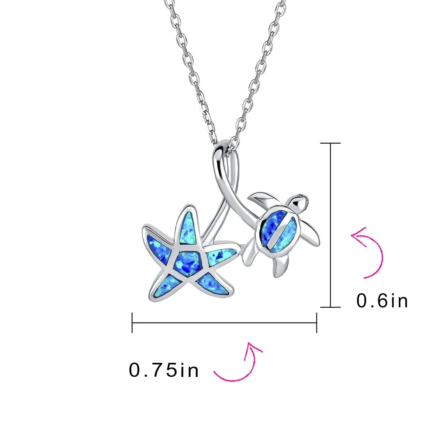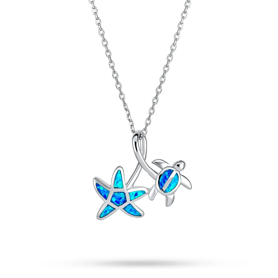 Nautical Blue Opal Sea Turtle Starfish Pendant Necklace in Sterling Silver - Bling Jewelry