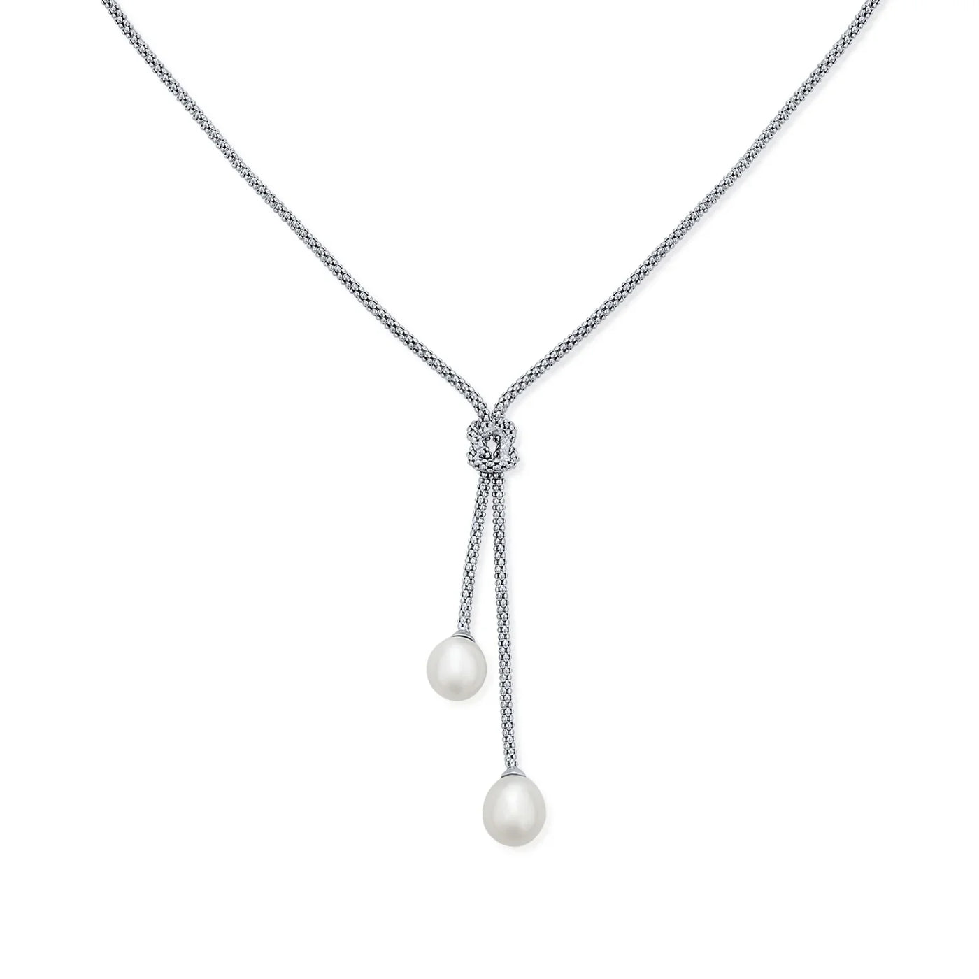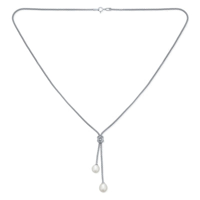- This elegant lariat knot necklace features two asymmetrically set 7mm pearls, adding a final touch of sophistication. Made of subtle sterling silver, this versatile 16in necklace is the perfect gift for your special someone, guaranteed to be worn over and over again.