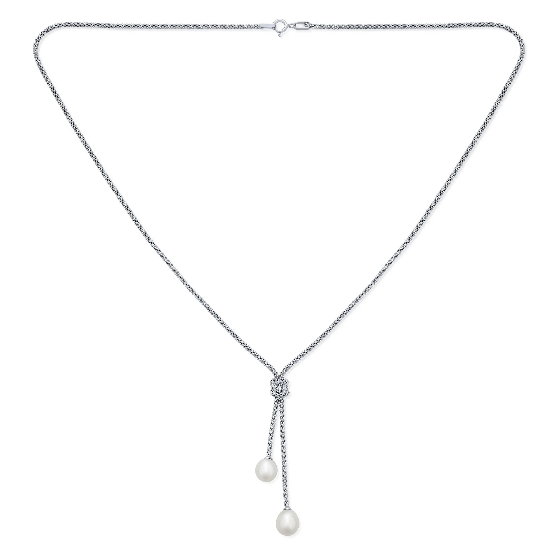 - Elevate your style with our exquisite .925 Sterling Silver love Knot lariat necklace. This chic piece enhances any outfit, day or night. Crafted with precision, it dangles from a 16-inch .925 Sterling Silver chain. Two lustrous freshwater pearls adorn each end. The subtle asymmetry adds intrigue to this stunning pearl jewelry. Versatile and affordable, it's perfect for everyday wear. Pair with other pearl jewelry for a dazzling effect. Make a lasting impression with this must-have accessory.