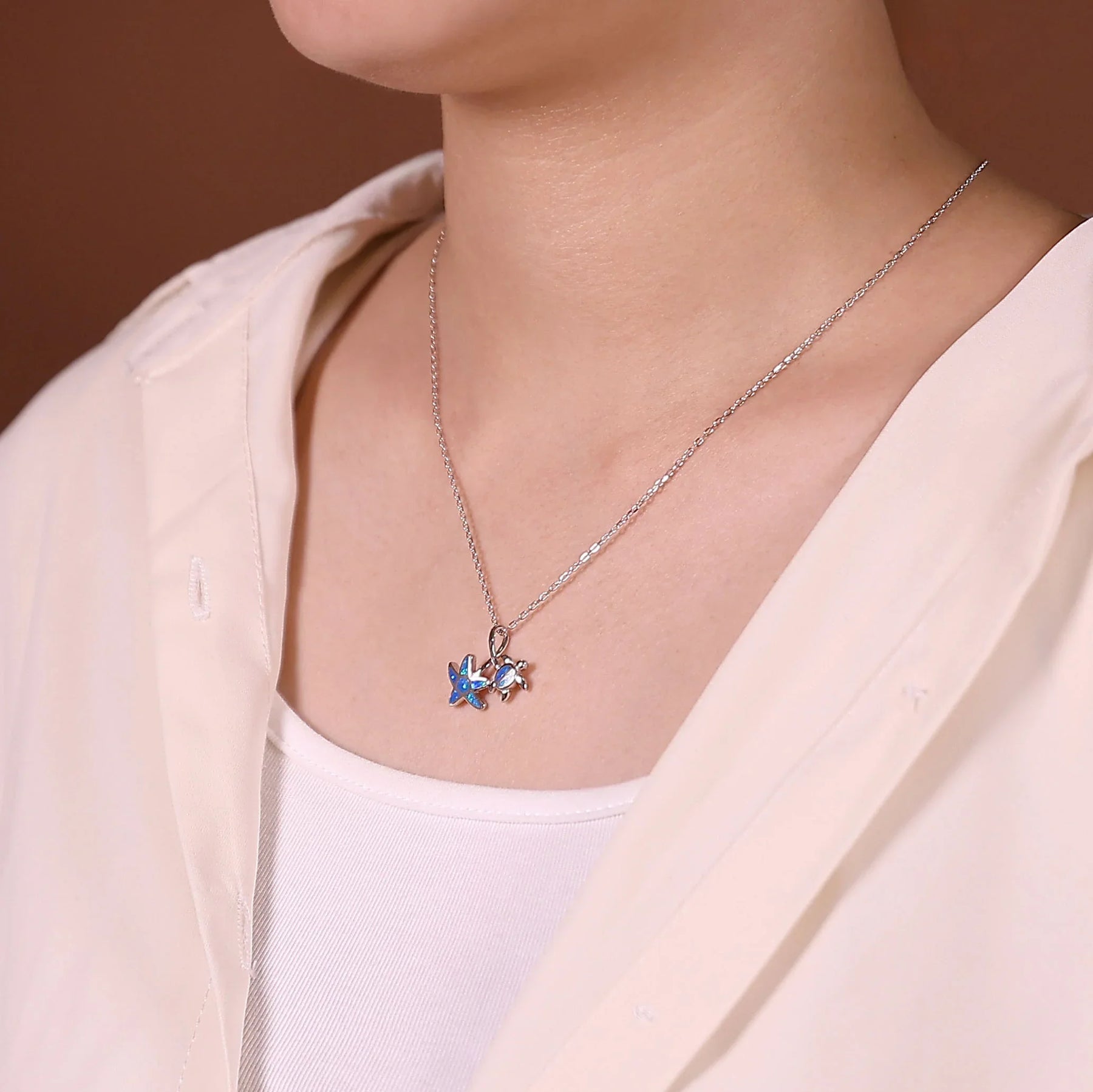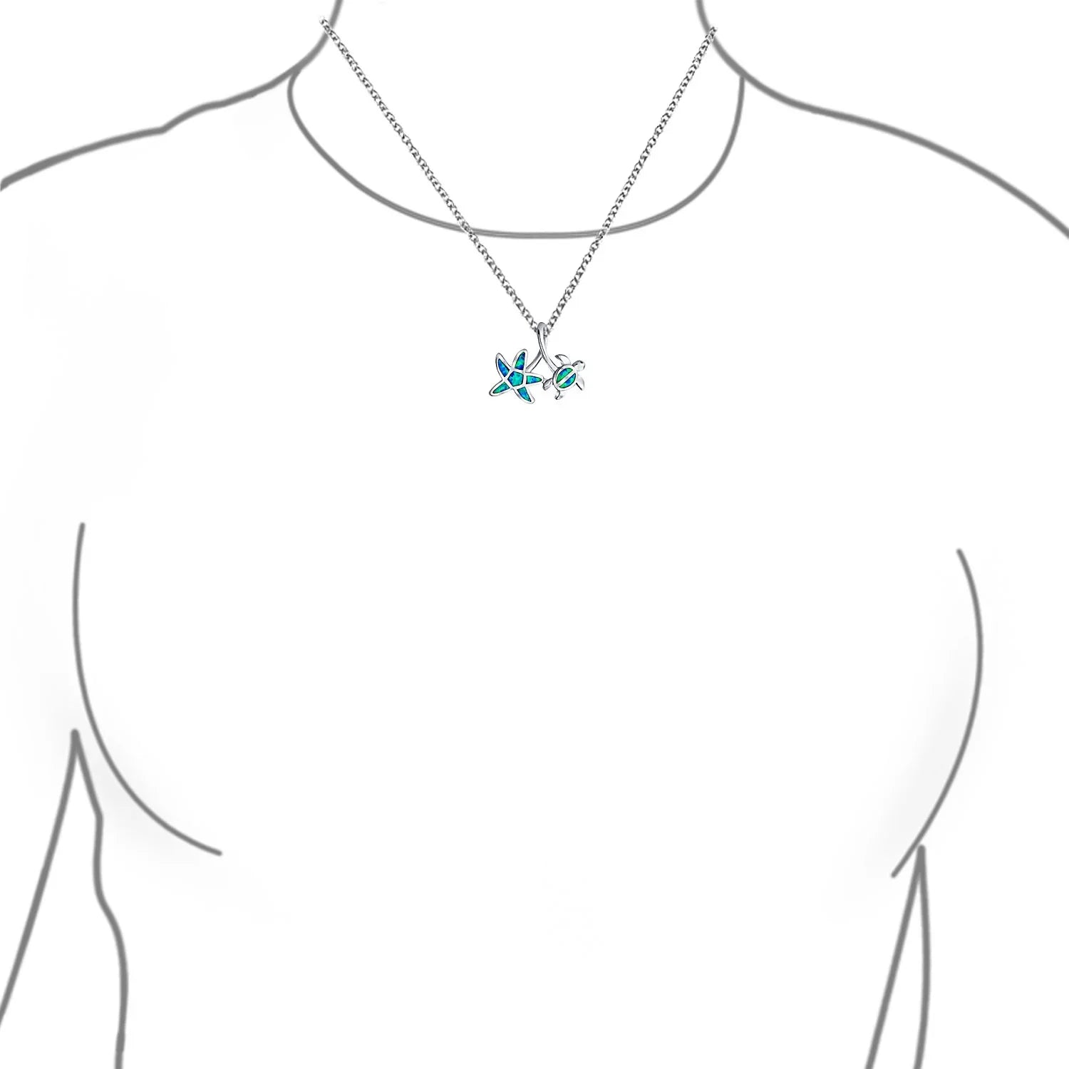 - Embrace summertime fun with our starfish turtle blue opal inlay beach pendant. Crafted in .925 Sterling Silver, rhodium plated for shine. Add whimsy to your summer jewelry collection with this cute nautical starfish pendant. Perfect October birthstone gift, featuring eye-catching blue opal. Unique beach jewelry with iridescent blue and green flecks. Ideal for pairing with bathing suits, shorts, and crop tops. Capture summer's essence with this nautical animal pendant. Free 18-inch Rolo chain included.