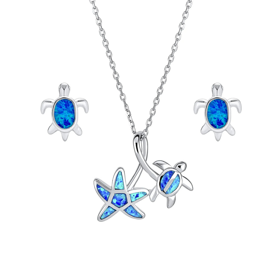 - Add a touch of oceanic charm to your jewelry collection with this stunning twisted pendant and stud earring set. The focal point of a beautiful nautical holiday blue opal necklace, this set features a turtle and starfish design that is sure to capture her heart. Symbolizing steadfastness and tranquility, the turtle holds a special place in religion, mythology, and folklore from around the world, making it a meaningful and unique gift for any ocean lover.