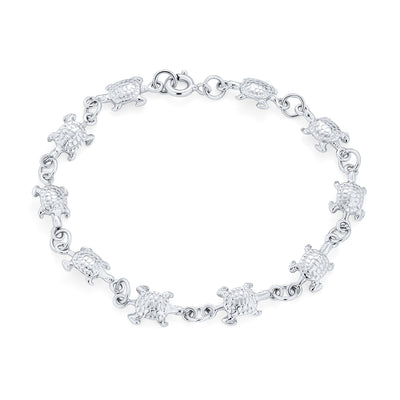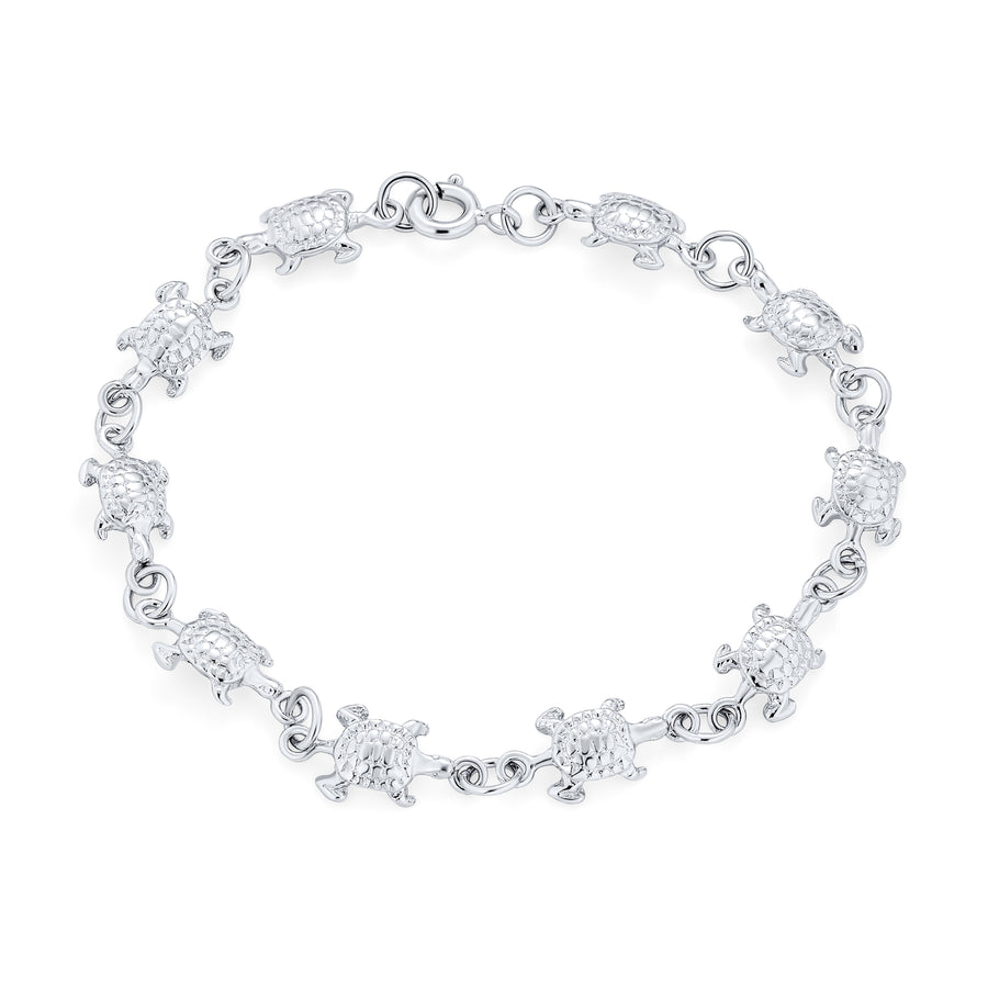 • Our newest sterling silver nautical turtle link bracelet is a perfect addition to her jewelry box. Crafted on a 7.5-inch chain with a secure spring ring clasp, this turtle bracelet is made of 925 sterling silver with an oxidized finish. Ten tiny turtles form a whimsical, beach-themed piece she will adore. Let her go to the beach in style this summer with these beautifully crafted creatures on her wrist. A fabulous gift for nautical jewelry lovers, this sea turtle bracelet complements her favorite summer styles. Add this cute sterling silver sea turtle bracelet to her Marine Life jewelry collection. This adorable accent enhances any outfit. Pair it with other turtle-themed pieces from our site for a complete nautical look.