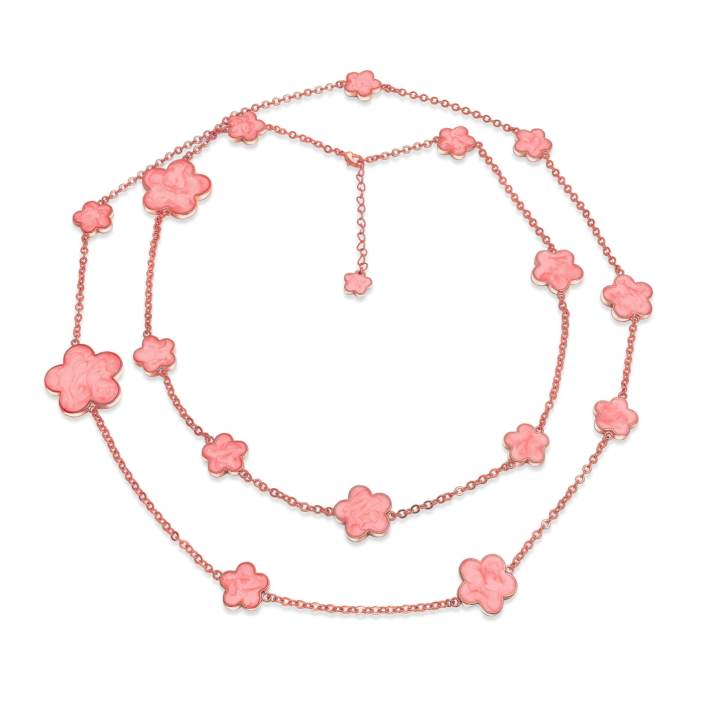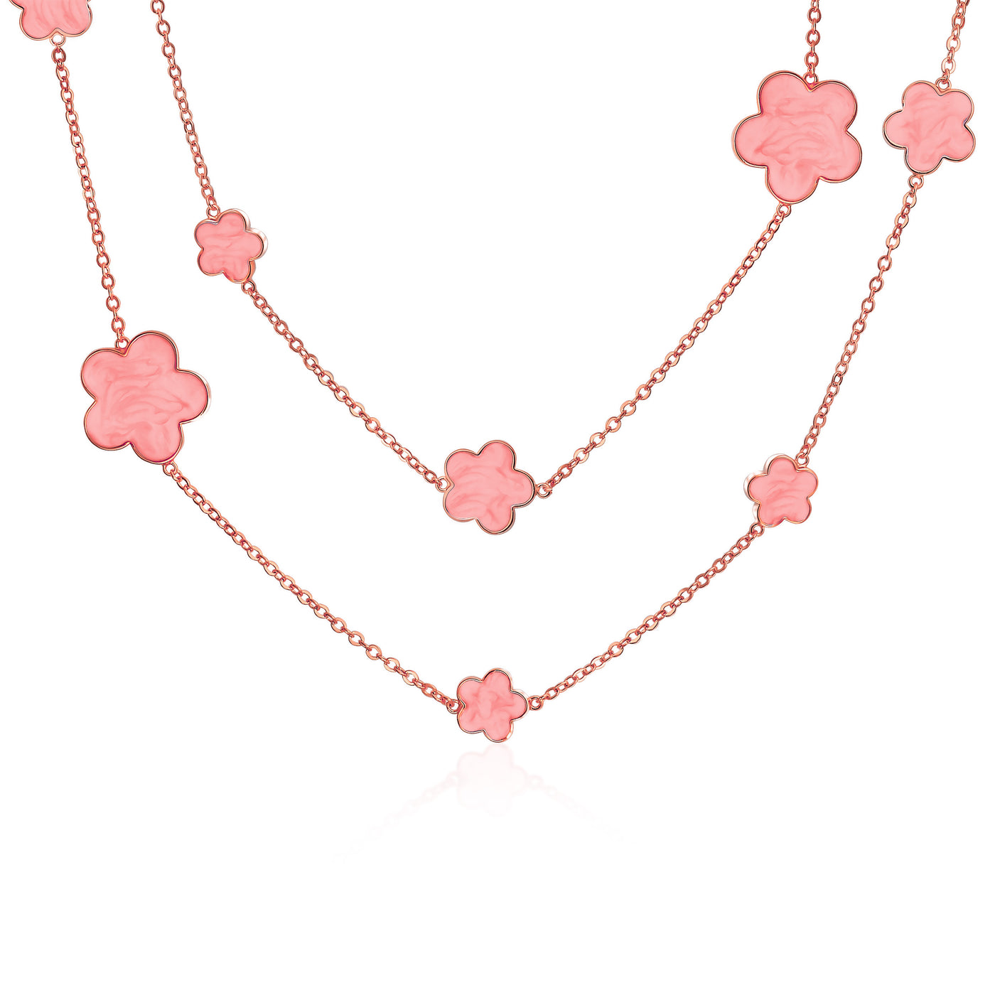 - Our Enamel Flower Clover Necklace is the season's must-have. Perfect for fashionable and chic ladies, this 42-inch rhodium-plated necklace features 16 sleek white enamel clovers. Clover sizes range from 0.5 to 1.5 inches in diameter. According to Irish legend, a five-leaf clover brings more luck and financial success than a four-leaf clover. Add this lucky charm to your jewelry collection. Wear it as a single chain or double it for a layered look. Sophisticated and feminine, this versatile piece transitions from daytime to nighttime glam effortlessly. Part of our latest flower jewelry collection.