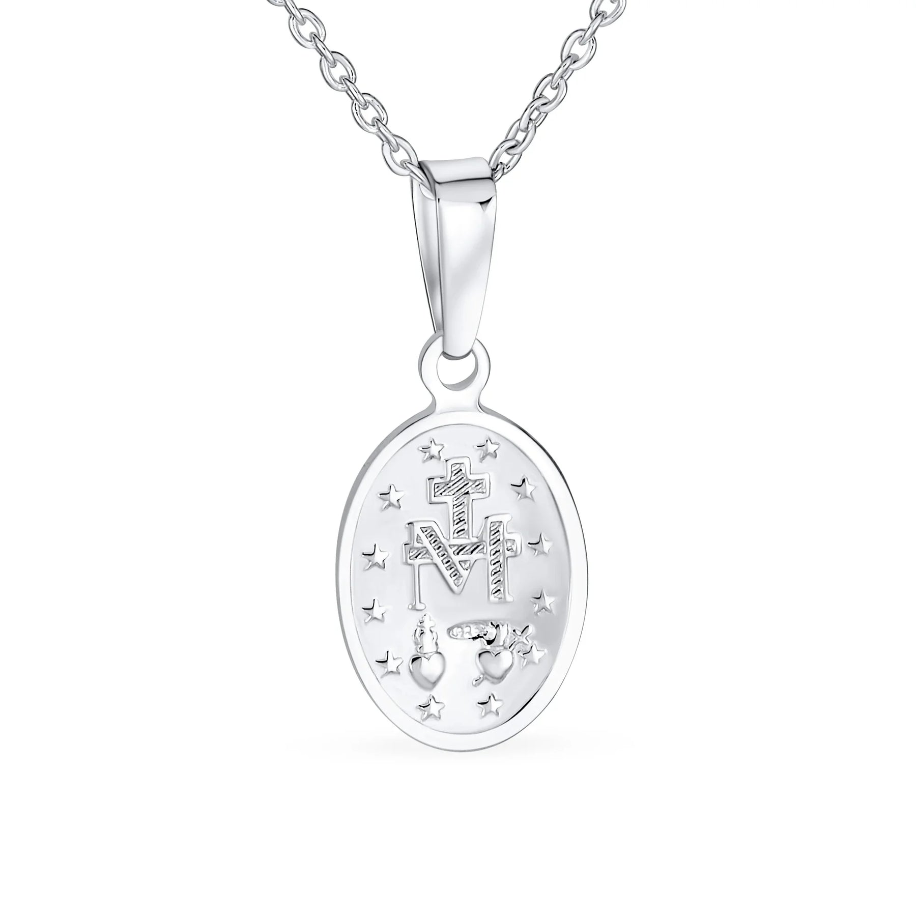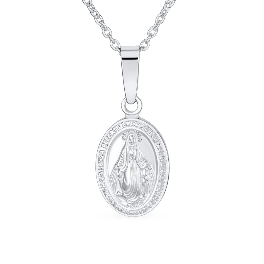 - This polished .925 Sterling Silver Mary pendant replicates original medals. One side shows Mary as Queen of Heaven and Earth. The reverse side features 12 stars symbolizing apostles and an intertwined M and cross. This Virgin Mary pendant is a cherished spiritual gift. Includes an 18-inch chain.