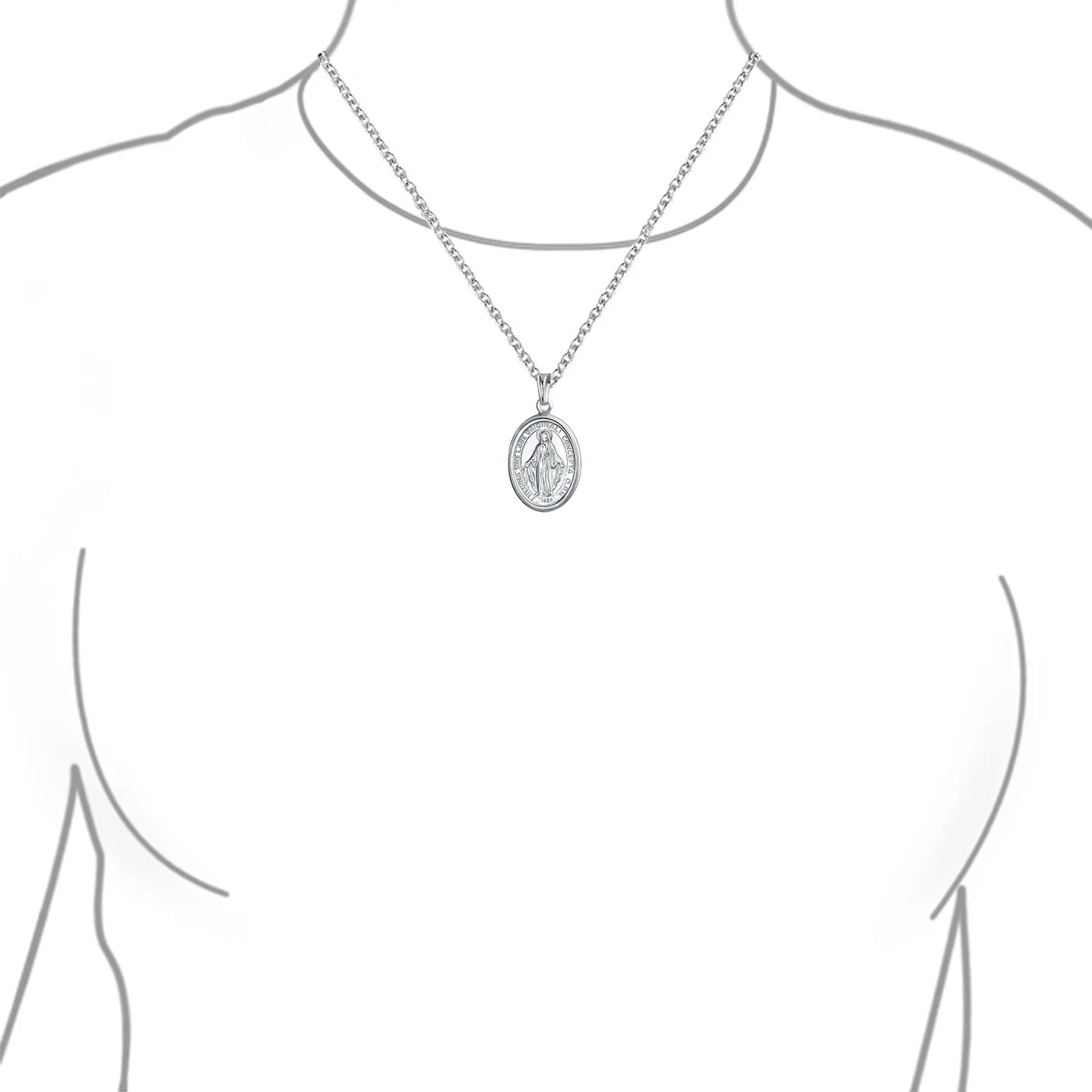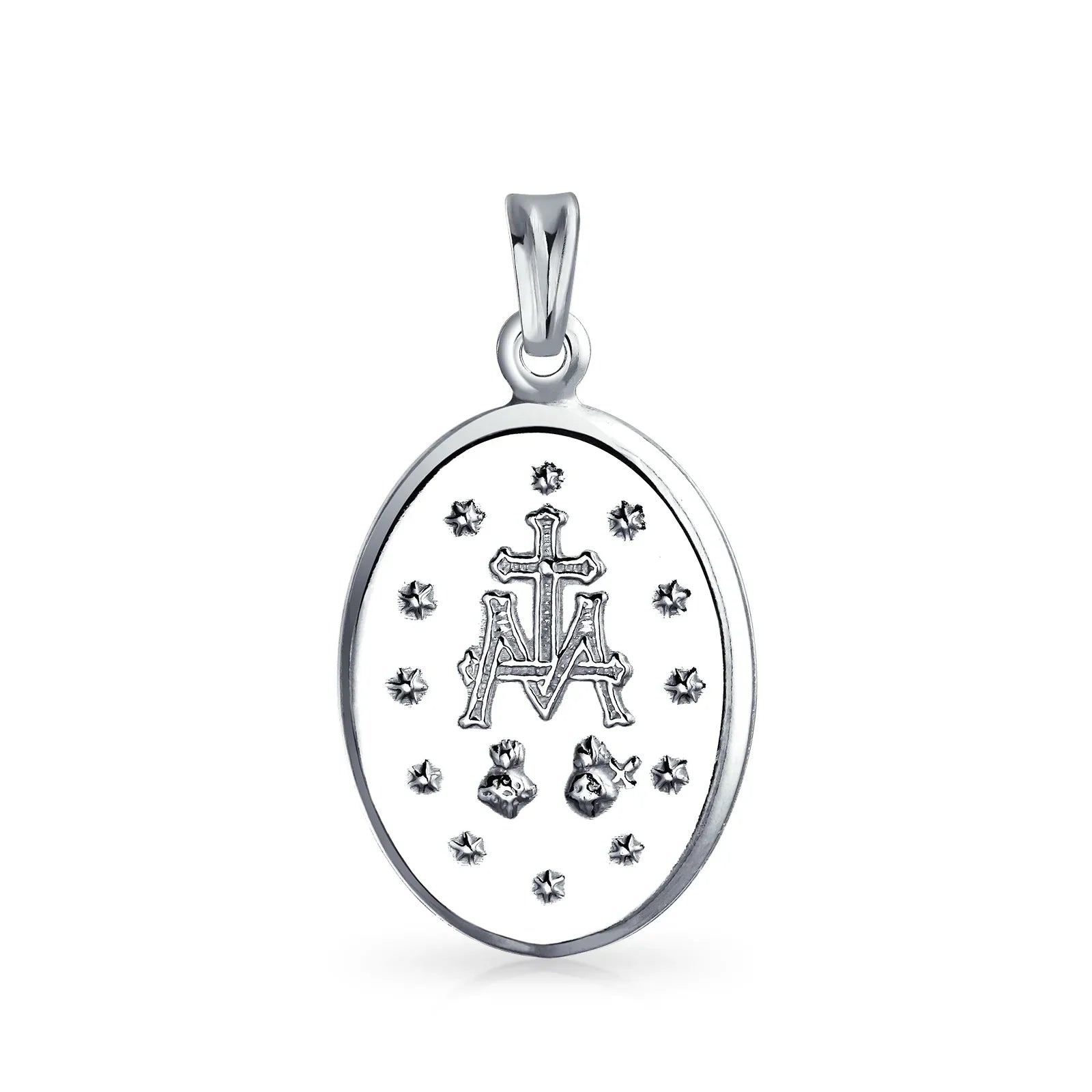 - This polished .925 Sterling Silver Mary pendant replicates original medals. One side shows Mary as Queen of Heaven and Earth. The reverse side features 12 stars symbolizing apostles and an intertwined M and cross. This Virgin Mary pendant is a cherished spiritual gift. Includes an 18-inch chain.