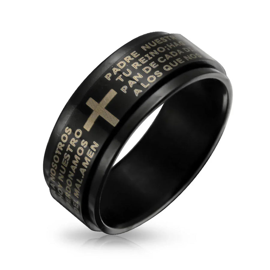 • Our religious jewelry holy cross Lords Prayer ring in Spanish, spins the classic script on the outer band for a modern look with a smooth feel. These stylish black stainless steel Rings for men make perfect religious gifts for keeping their faith close at hand. Makes great Fathers Day gifts.