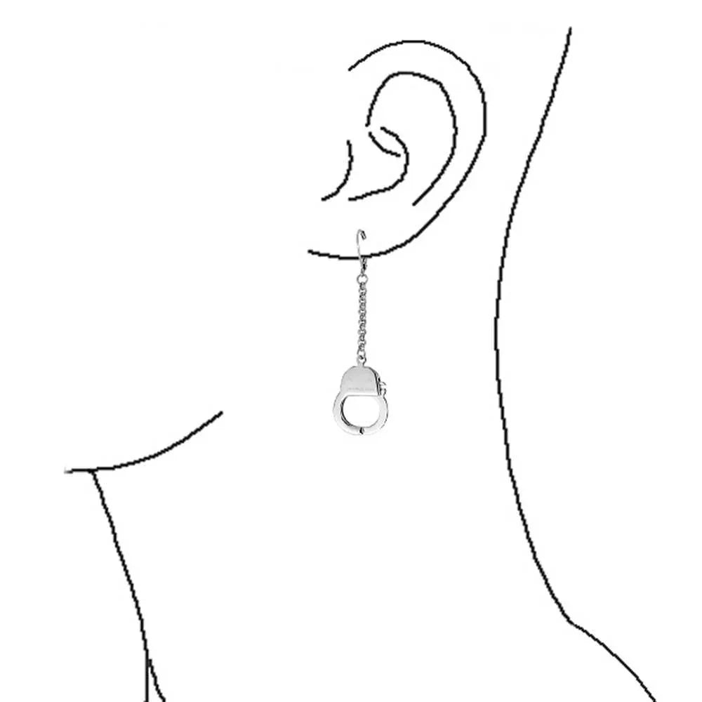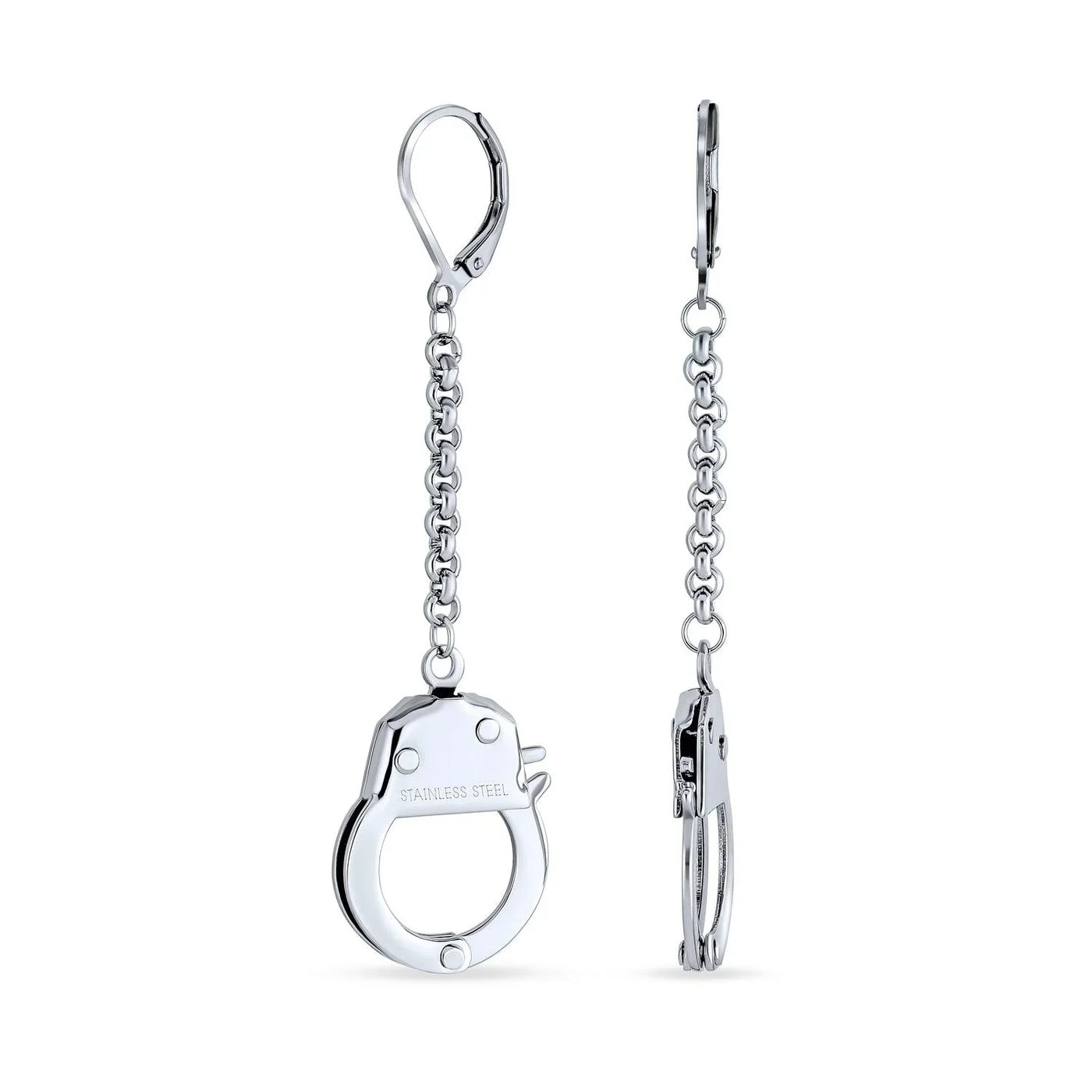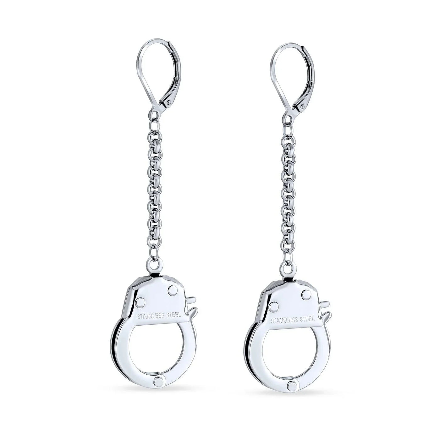 - These whimsical dangling leverback earrings are novel inspired with two fully functional, miniature stainless steel handcuffs. These hand-cuff earrings are for pierced ears and bold style.