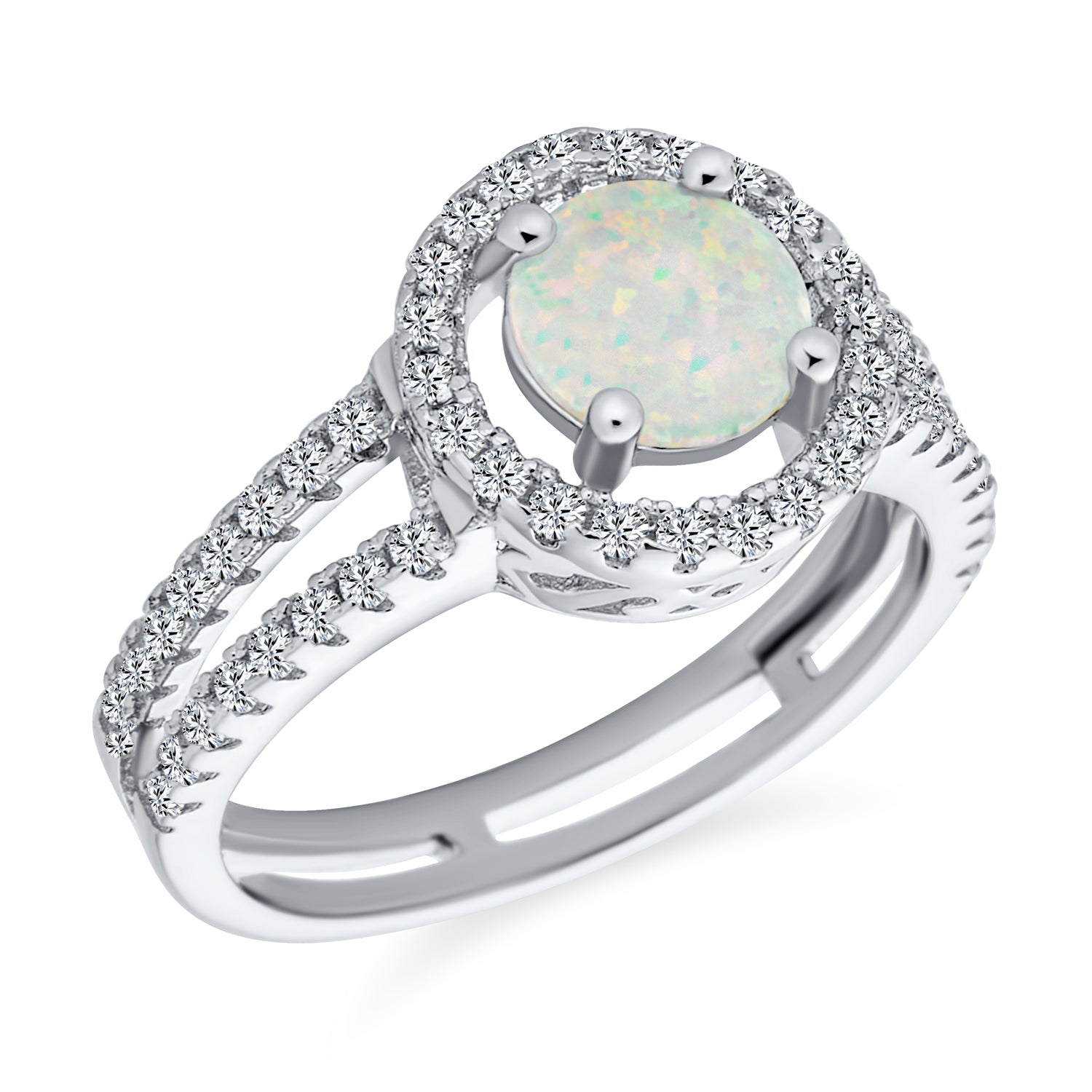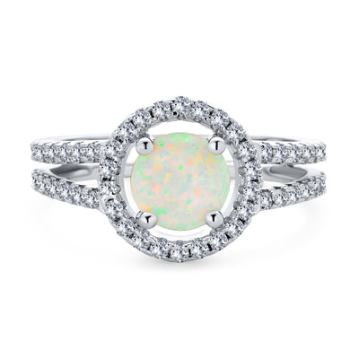 - Feminine timeless Opal Ring-for a traditional antique vintage look with this circlet style gemstone classic halo ring. Created opal ring has a split shank band with cubic zirconia side stones for add sparkle, comfort and stability.
