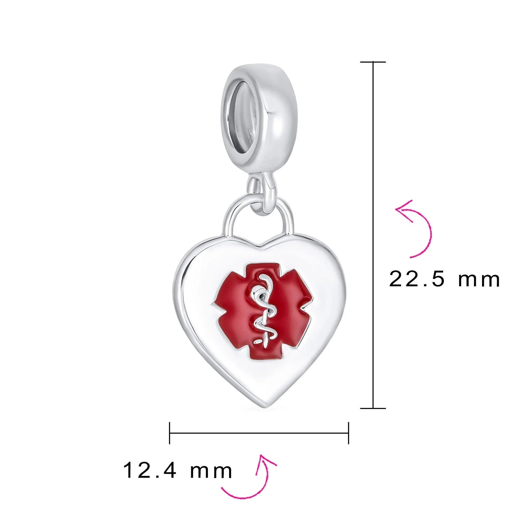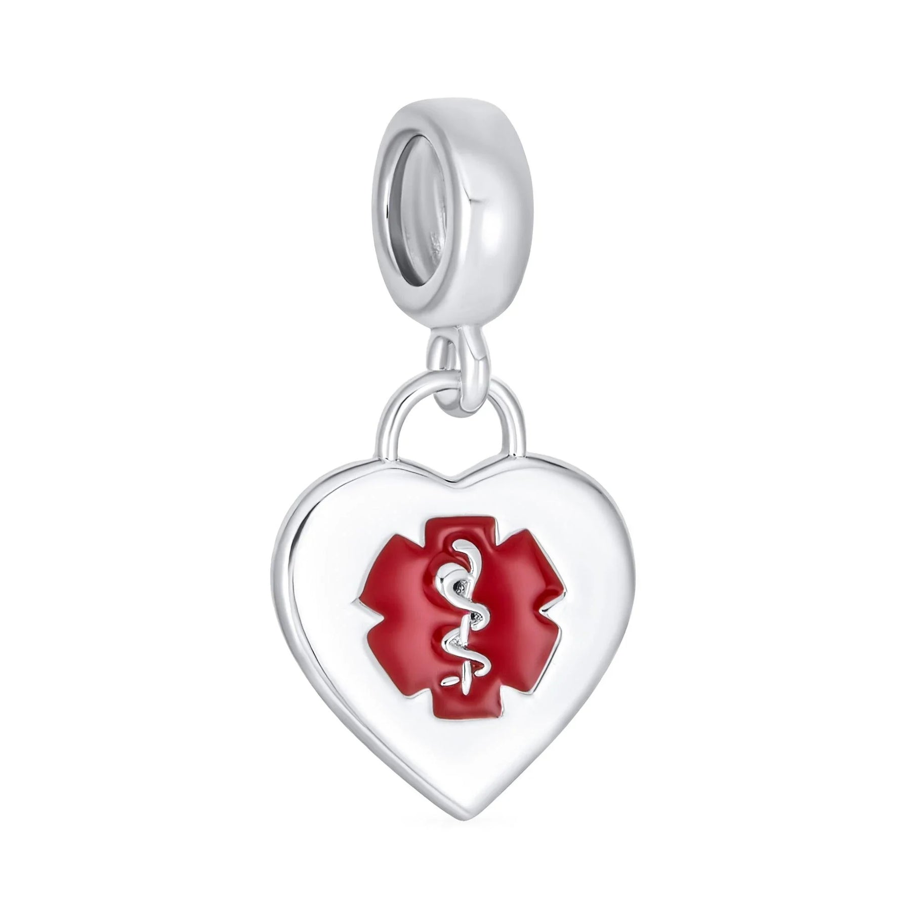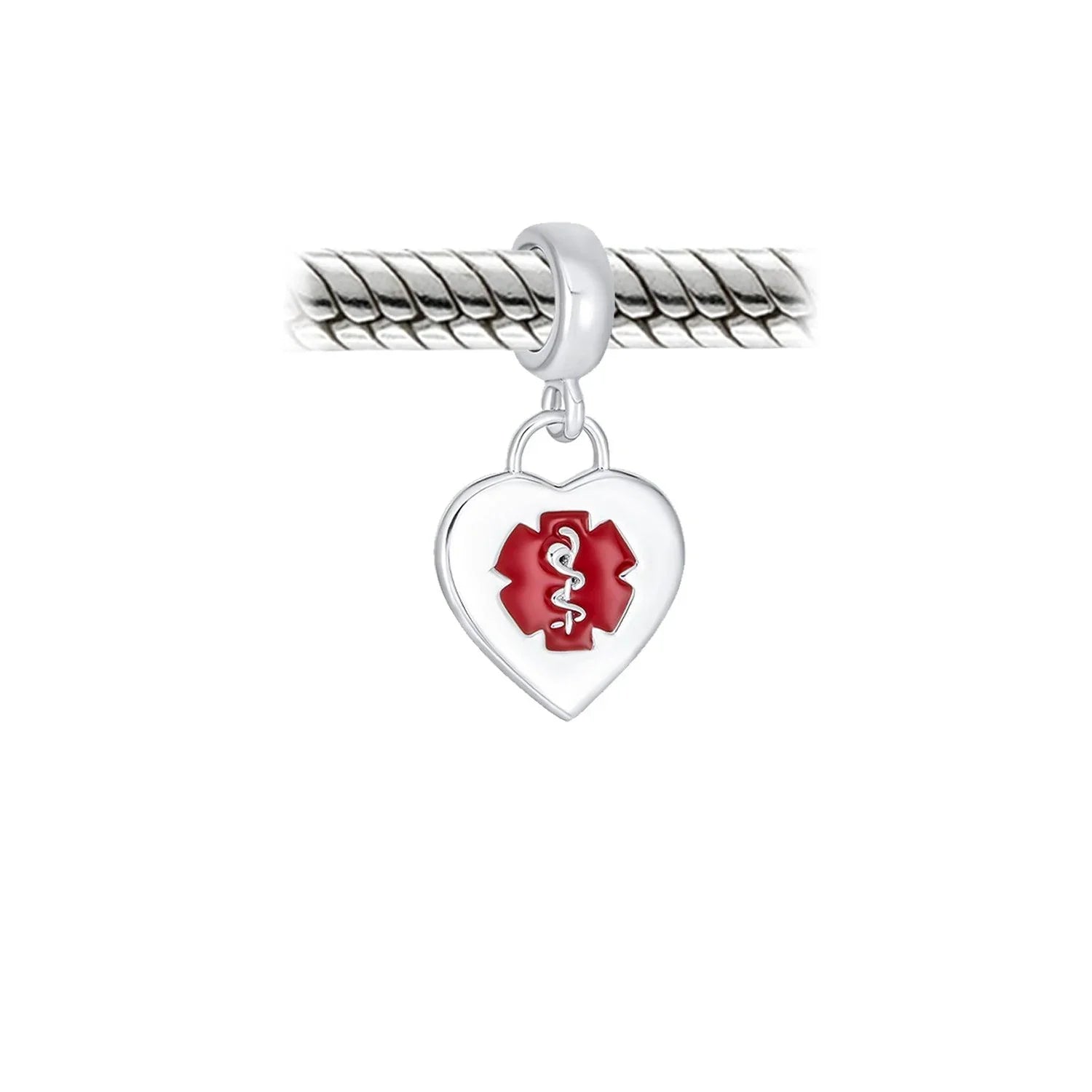 - Customize it for to identify in case of a medical emergency. A dangle heart bead charm with red caduceus the traditional symbol of medical at quick glance. PERSONALIZE – Engrave with a word, inspirational, letters, numbers, date, coordinates with script or block letters, our precision machine engraving ensures that your message is beautifully displayed. Click Customize Now to order.