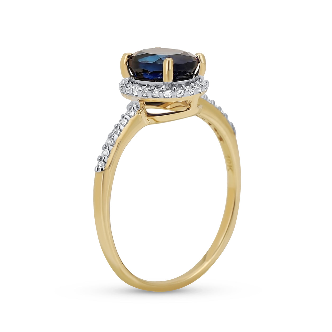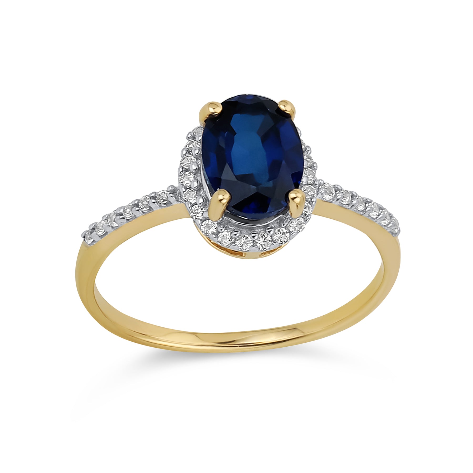 - Elegant halo ring featuring white sapphire side stones and a classic oval-shaped created Sapphire gemstone, the September birthstone. Crafted in 10K Yellow Gold, this dainty ring exudes timeless sophistication and understated luxury.