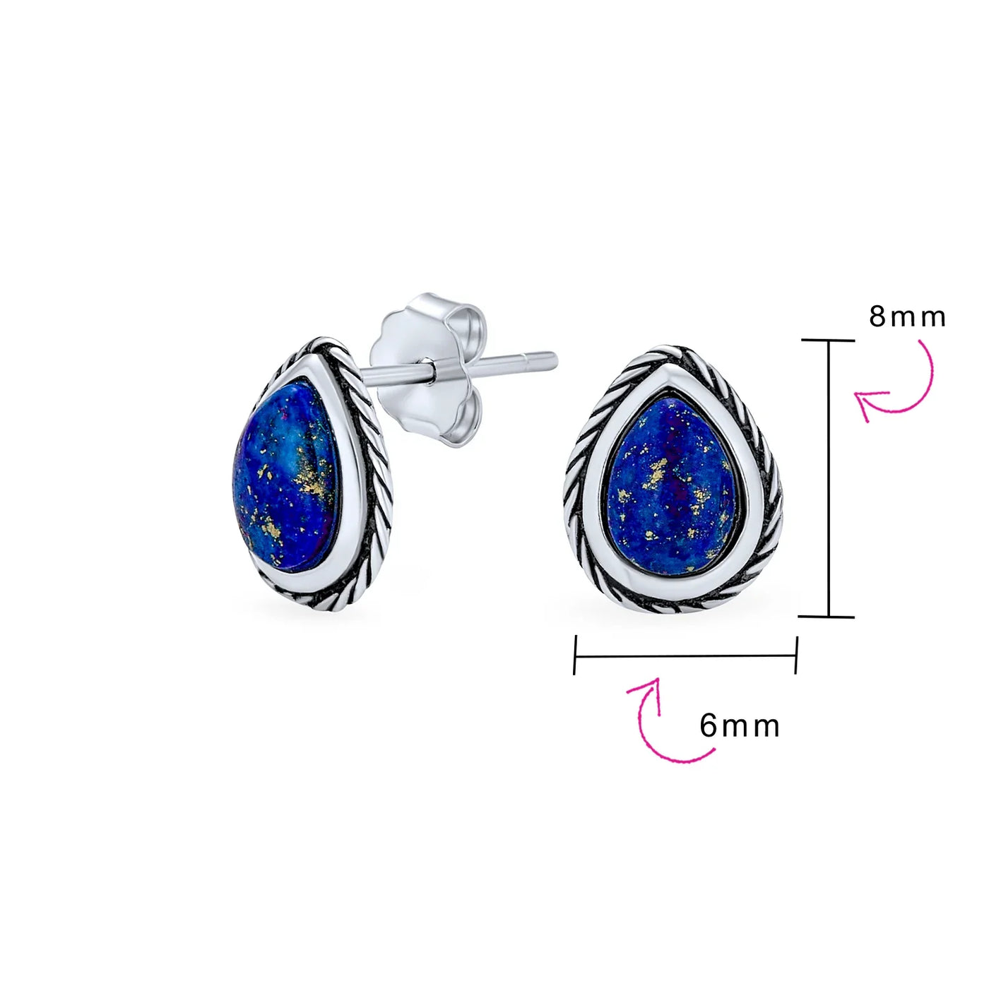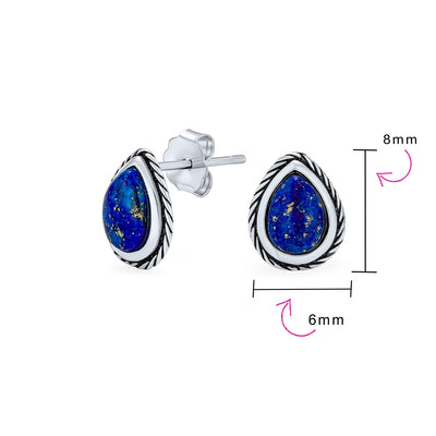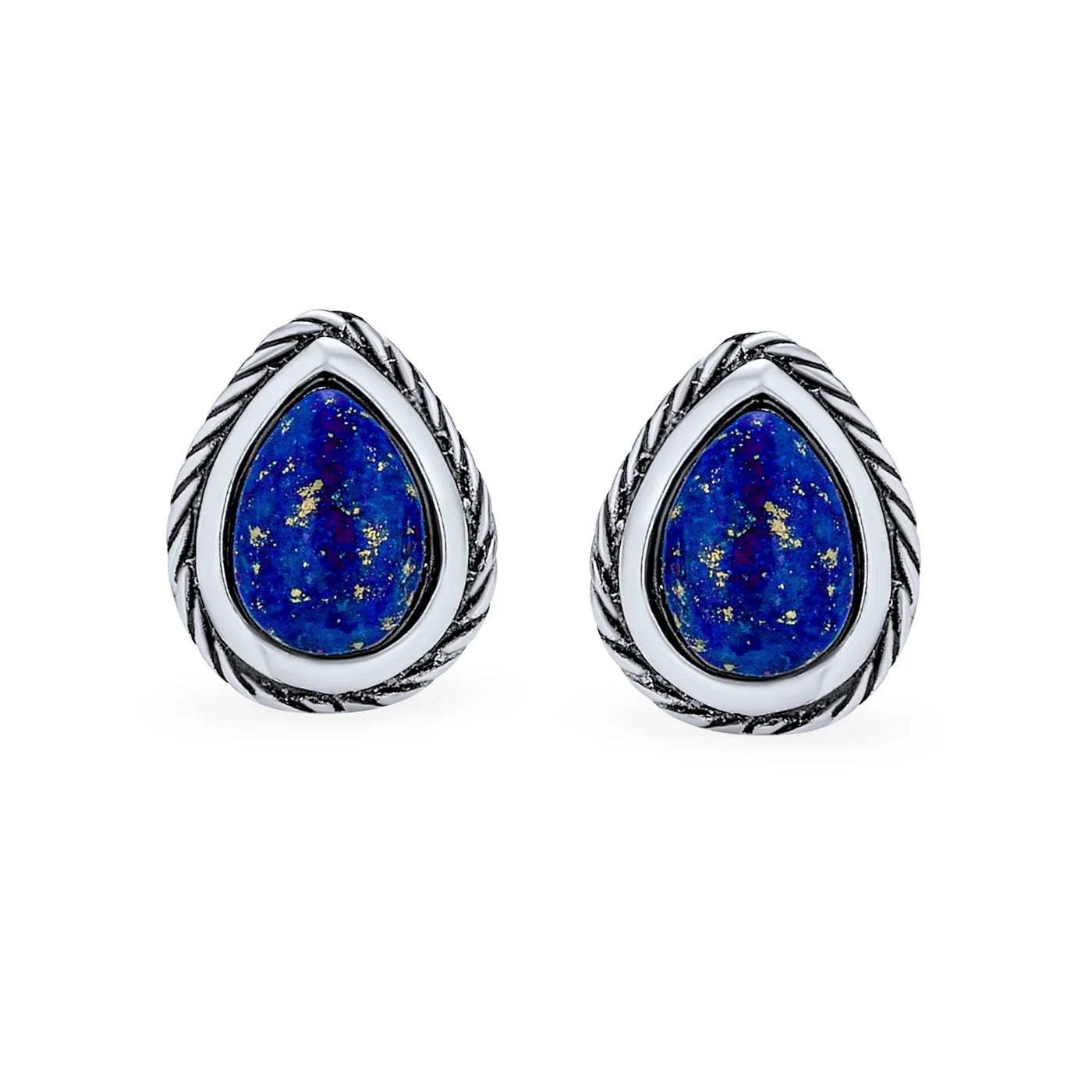 - These delicate sterling silver studs feature a pear-shaped Blue Lapis Lazuli centerpiece, perfect for the stylish fashionista. Chic and polished, these small earrings boast an intricate ornate silver design outlining the Blue Lapis Lazuli. Add flair to your lobes with these alluring silver stud earrings. Note: Natural stones may vary in color.