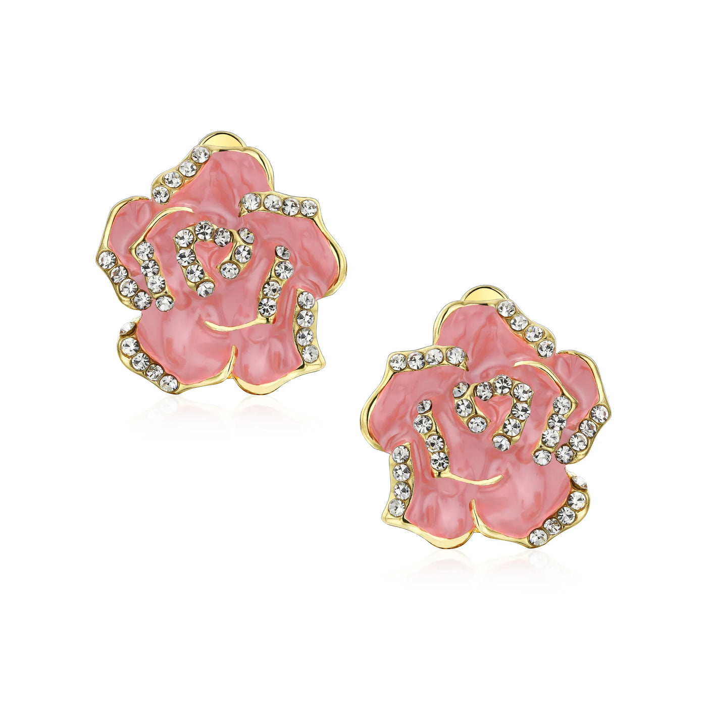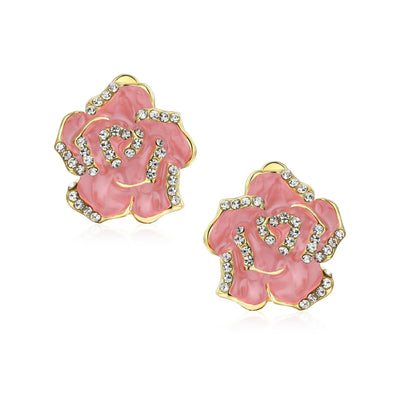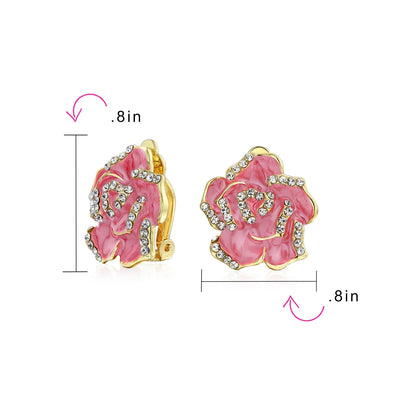 Pink Red Enamel Flower Crystal Edge Clip-On Earrings Gold Plated For Non-Pierced
