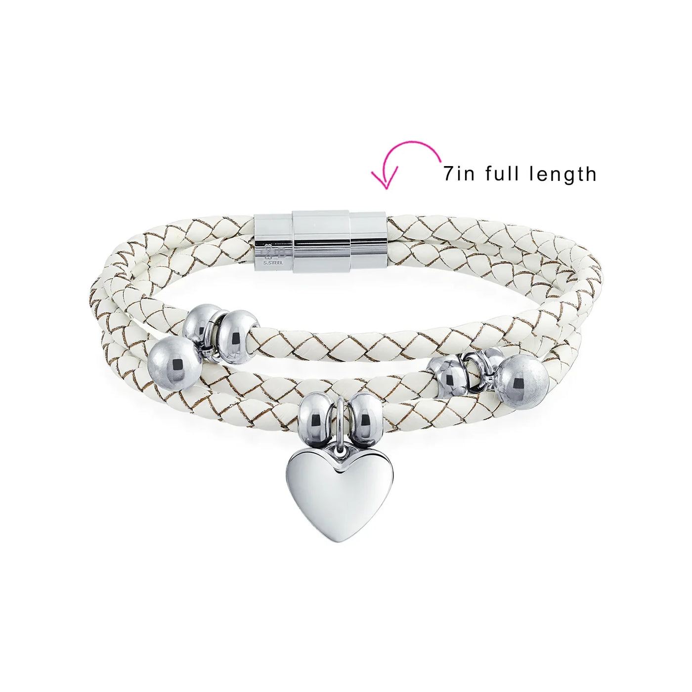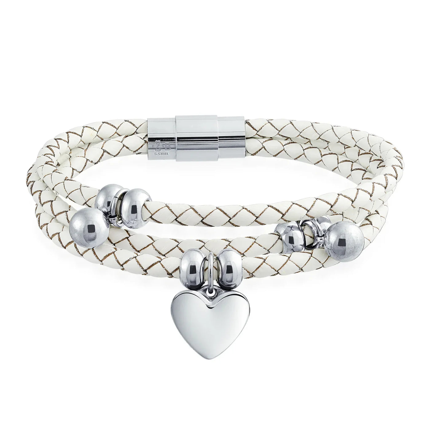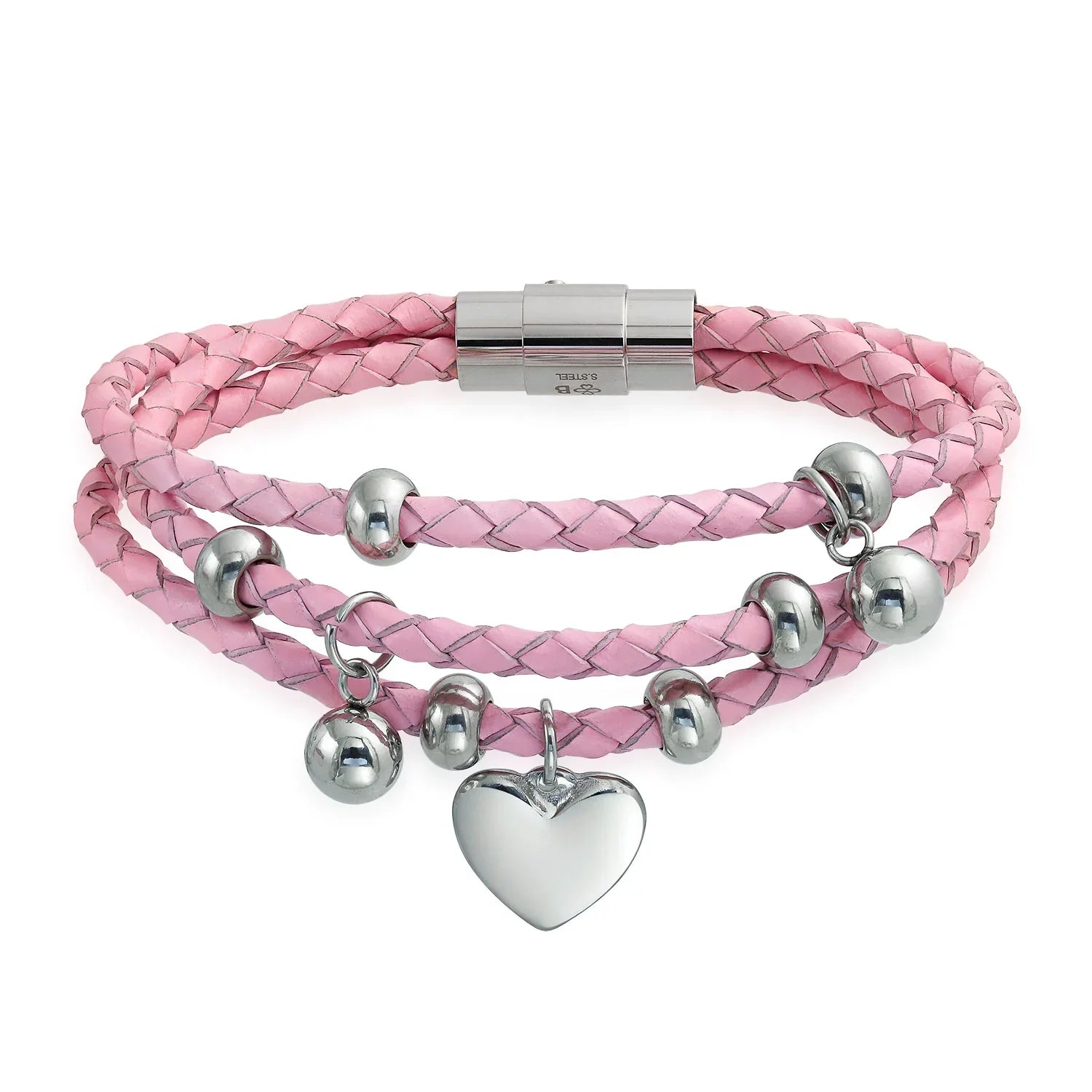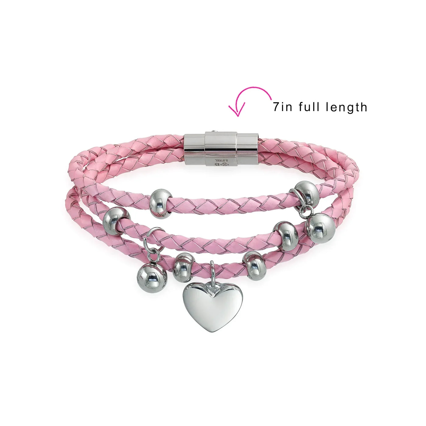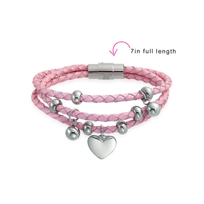 Pink or White Wrap Bracelet Braided Leather and Heart Charms Stainless Steel