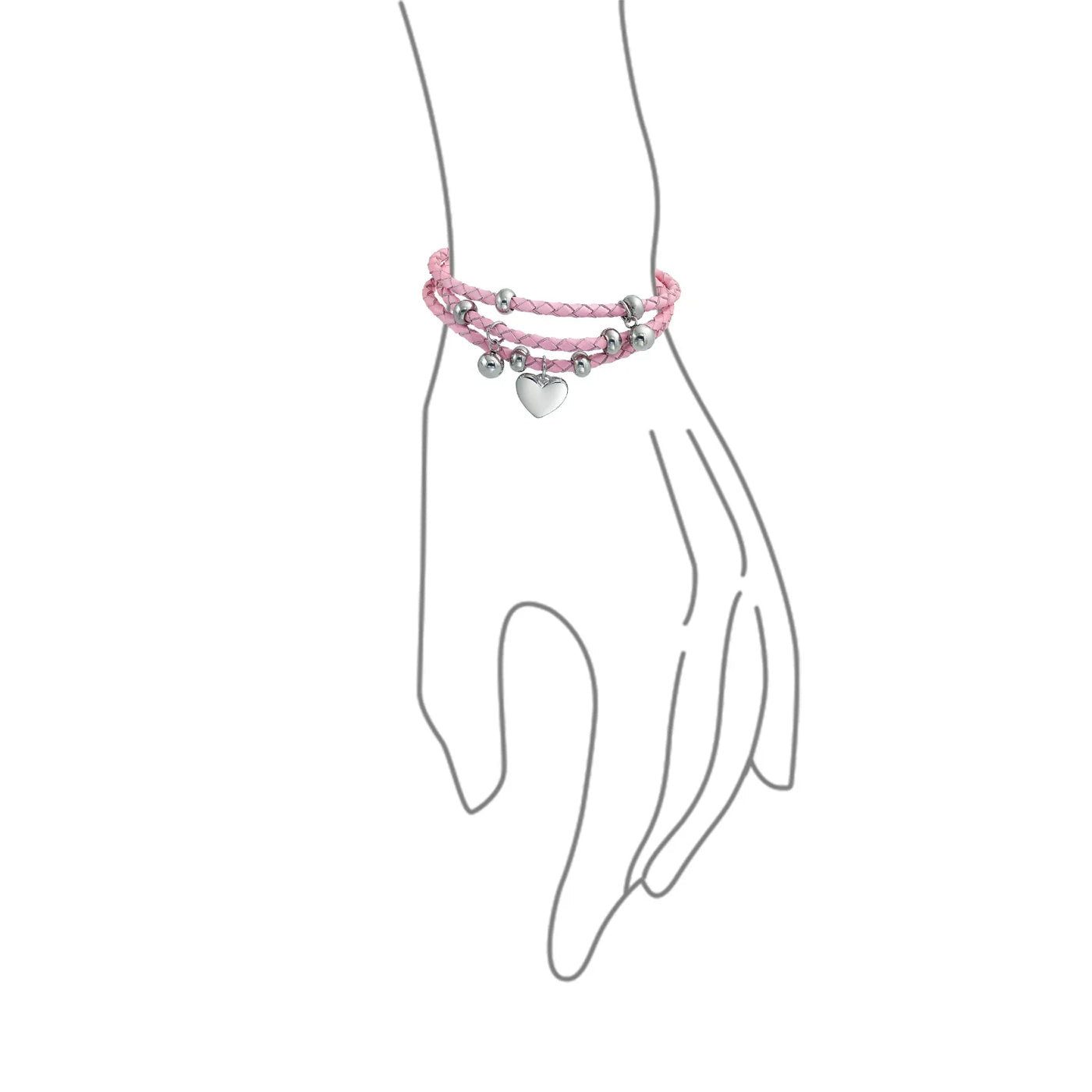 • Love is in the air and on your chic wrist without very pretty and feminine triple strand braided pink leather charms bracelet. The three dangling heart charms are made of polished stainless steel, as are the round spacer beads that rest on either side of the dangling hearts charms. All of the charms move slightly, giving our pink leather charms bracelet great movement and an unusual look. It is a dainty accessory that will add a creative sparkle to your wrist. At just under 25 grams and 8 inches in length, our pink leather braided triple strand bracelet has a lightweight and comfortable feel. It secures with a screw hook that is very easy to put on and to take off. Pink heart jewelry looks great with any outfit and makes a perfect gift of Valentines day jewelry.