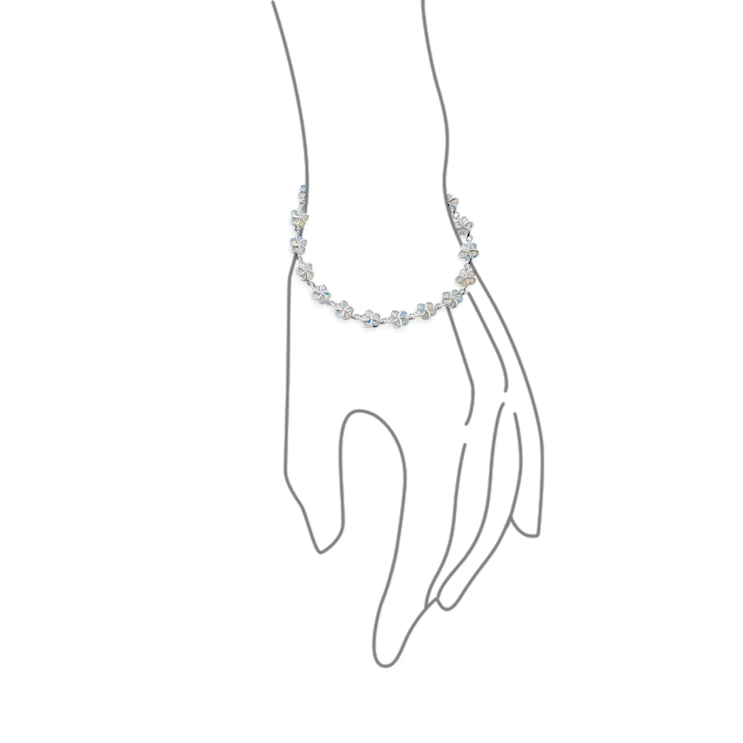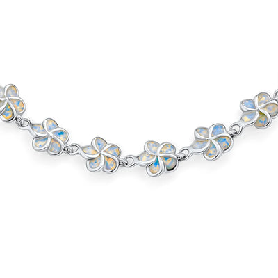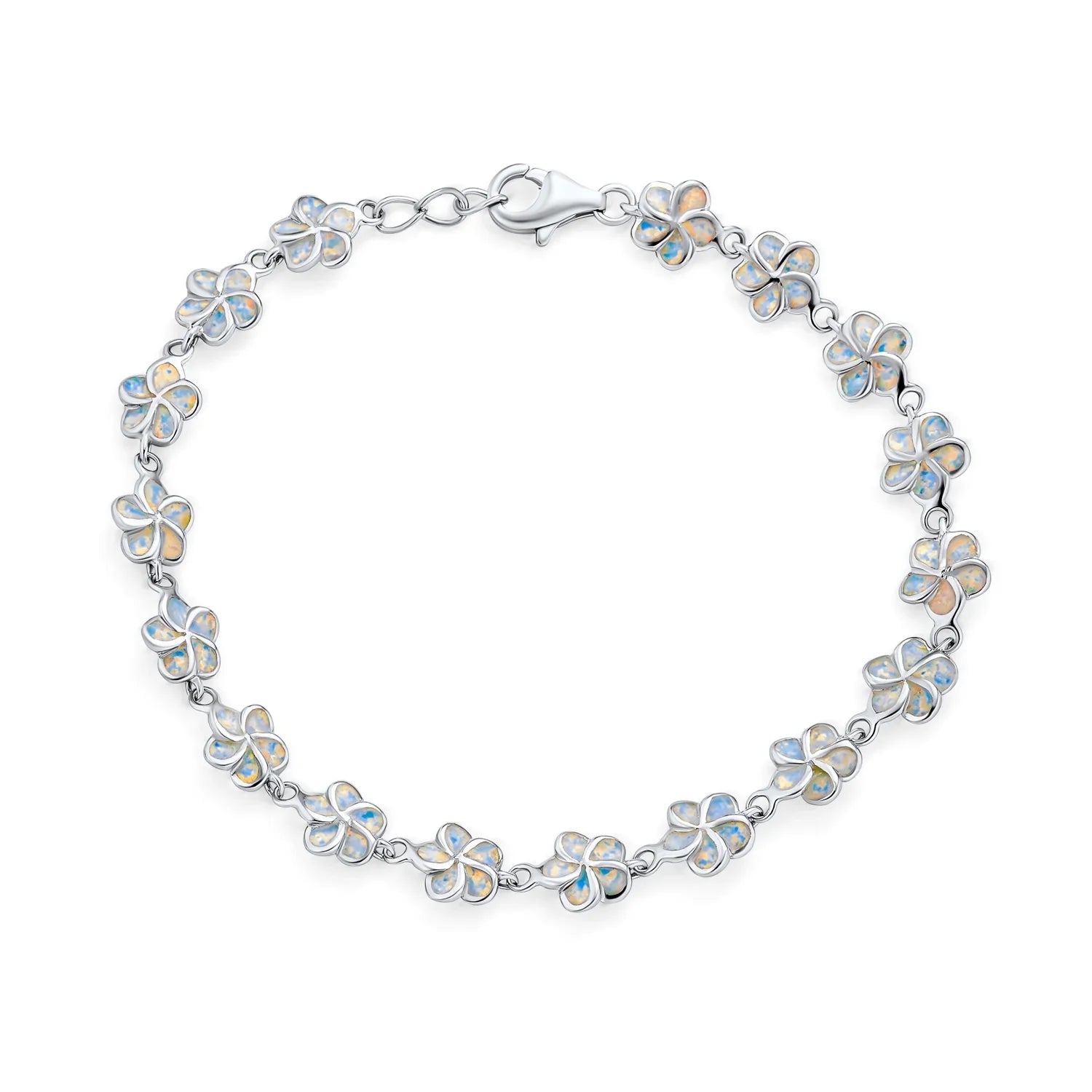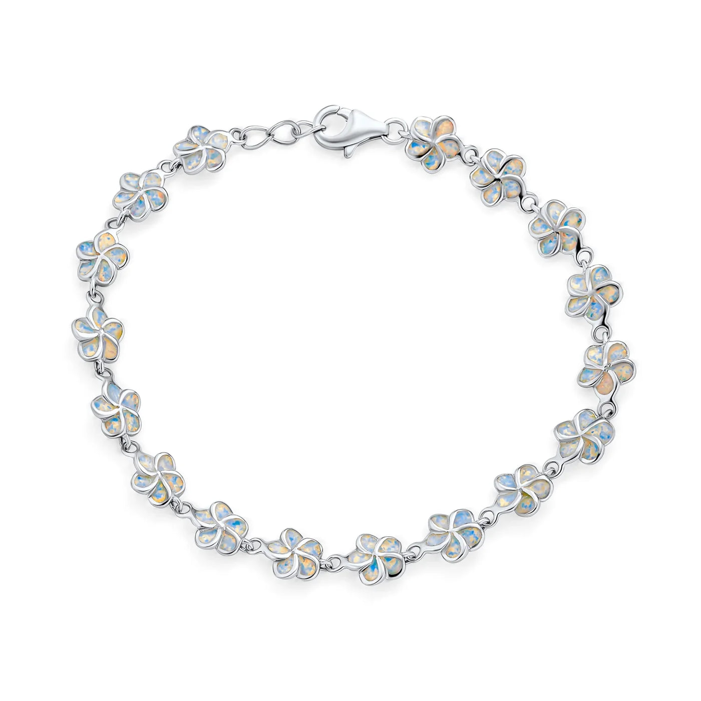 - Add an enchanting, feminine touch to your look with a tropical feel with this exquisite .925 silver link charm bracelet. Plumeria flower motifs elevated by mesmerizing synthetic opal. Lovely for an October birthday.