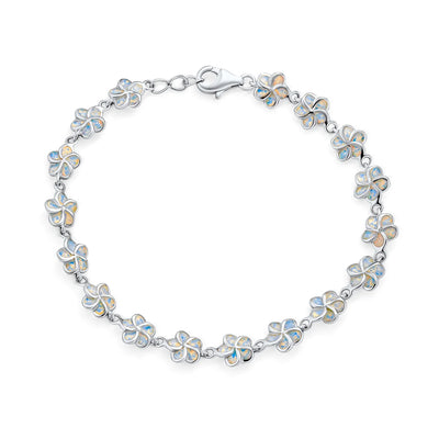 - October is the Created Opal birthstone month. Surprise friends and family with a stunning Hawaiian Plumeria Flower Bracelet. The iridescent flowers on this silver bracelet are delicate and feminine. The milky Created Opal changes color with light. Silver Created Opal bracelets evoke beach vibes, perfect for any occasion. This .925 sterling silver flower chain is an ideal holiday gift. Rhodium plated to resist tarnish. Order one for a friend today!