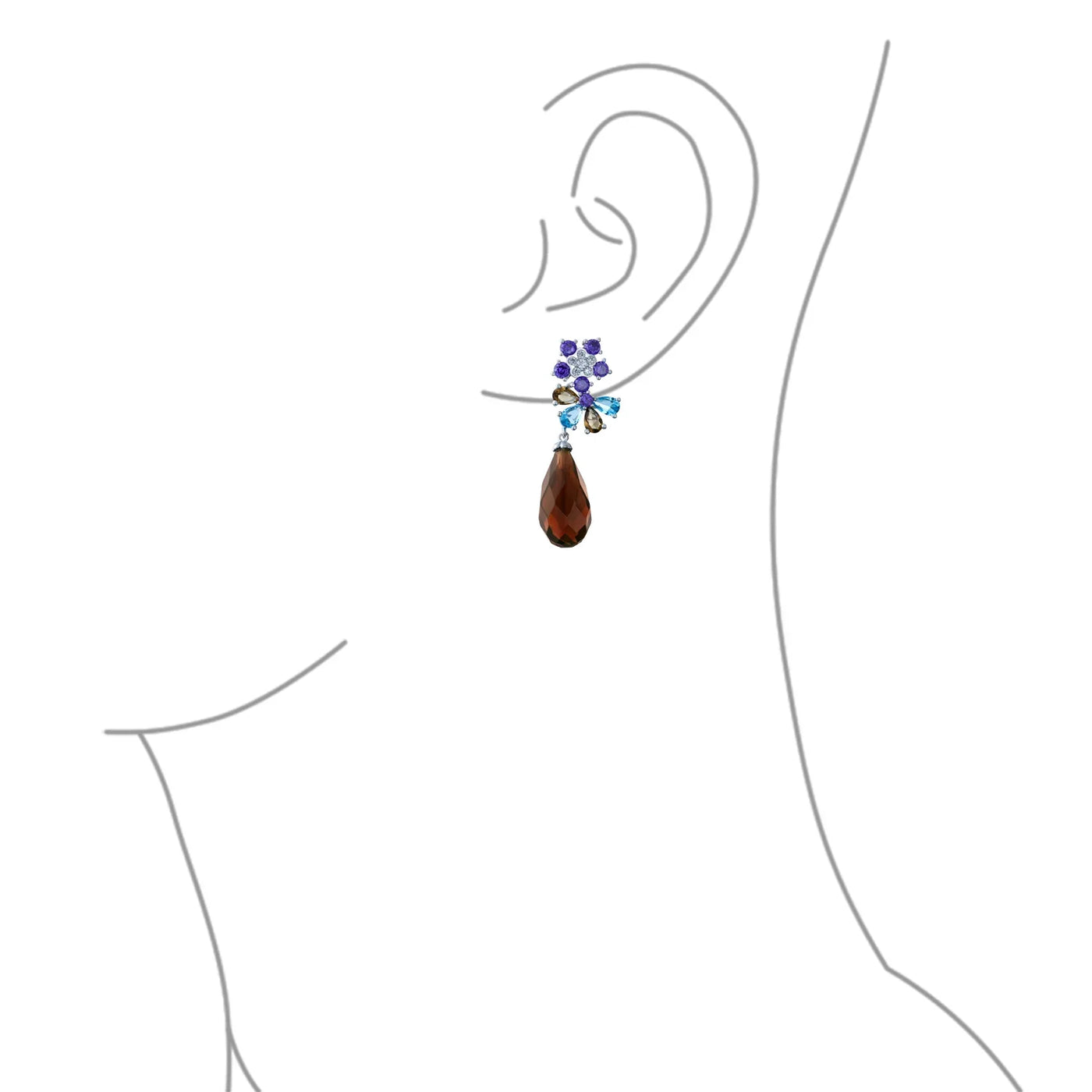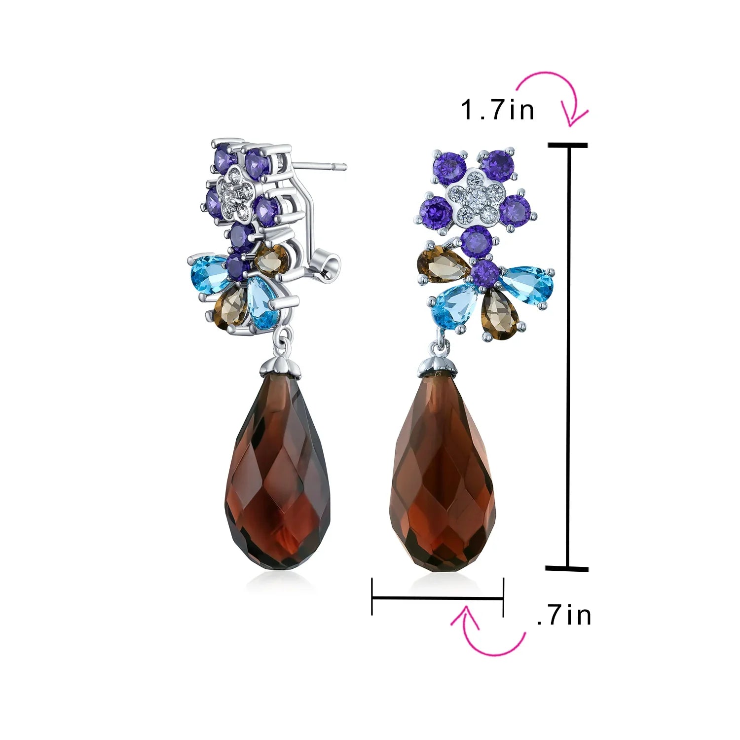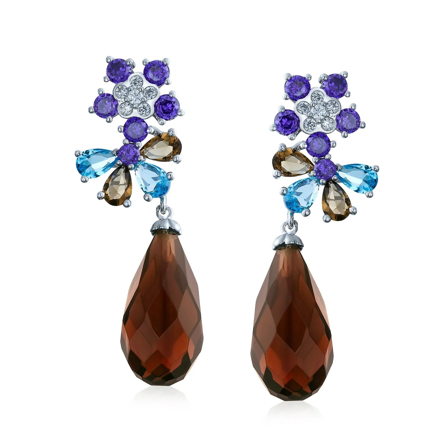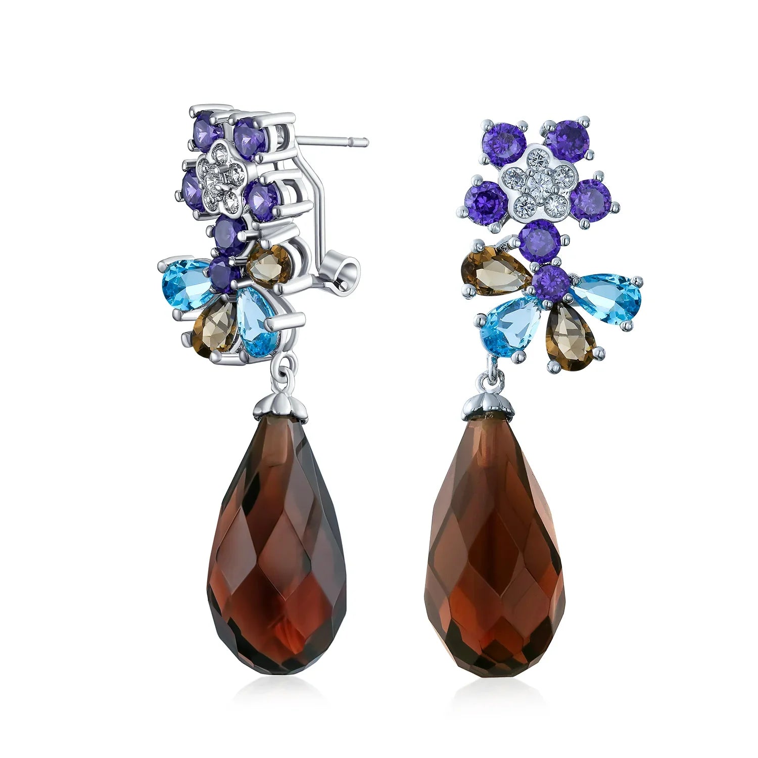 - Unleash your floral elegance with Blue and Purple CZ Briolette teardrop Floral Omega Drop Earrings. These chic, affordable flower earrings exude free-spirited charm. Crafted from rhodium-plated brass, they feature dazzling blue and purple cubic zirconia stones. The briolette Simulated Amethyst teardrop adds ultimate glam. Perfect for any outfit, these earrings make an ideal Mother's Day or holiday gift.