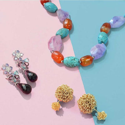 - Enhance your style with a touch of feminine charm and vibrant color with these stunning brass omega back earrings. Featuring simulated amethyst and aquamarine cz's and glass, topped off with a captivating briolette and floral cluster design.