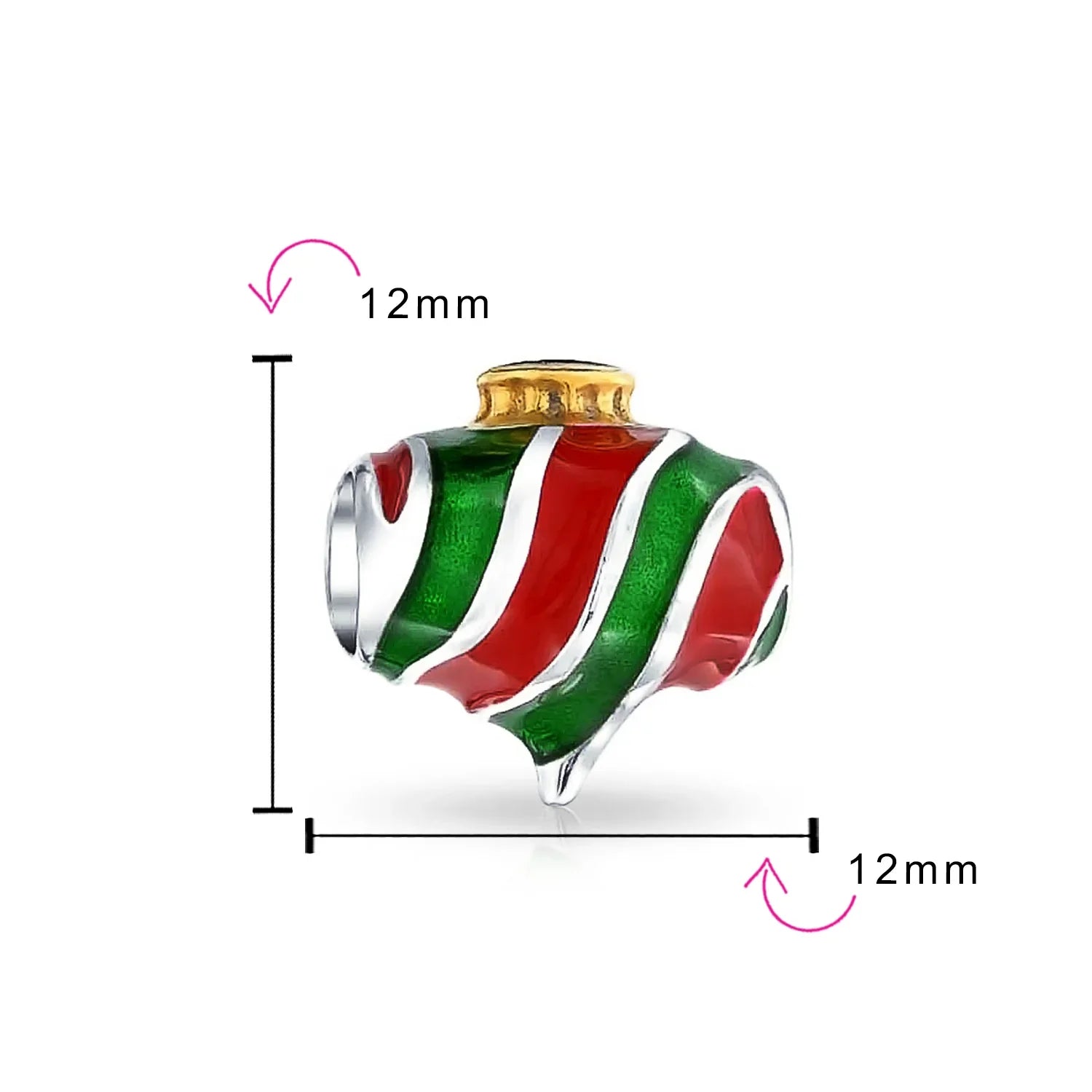 - Enhance your Christmas tree or holiday bracelet with this adorable sterling silver charm bead. Crafted with .925 sterling silver and gold accents, it features festive red and green enamel stripes. Measuring 12mm with a 5mm core, this lightweight charm weighs 2.6 grams. Perfect Christmas gift for friends and loved ones.