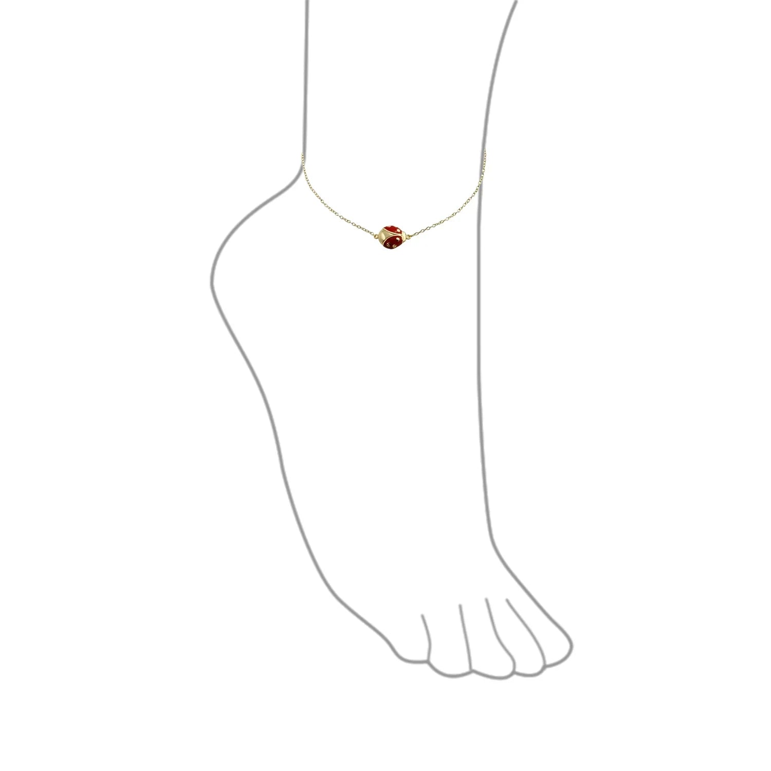 - Adorn your ankle with our charming gold-plated ladybug anklet. Crafted from 925 sterling silver, it's perfect for any ensemble. The red enamel ladybug design adds whimsical fun and instant insect appeal. Ideal for all ages, this anklet is a summer must-have. Measuring 9.5 inches, it secures with a lobster claw clasp. The delicate rolo chain includes a one-inch extender for adjustable fit. Sterling silver Ankle Bracelets are timeless, so add this to your cart now. Surprise a fashionable friend with this lucky red ladybug anklet. Both of you will be in luck this season!