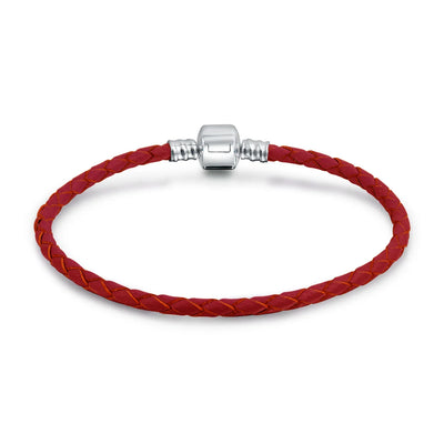 - Embrace your edgier side with our braided leather bead bracelet . This red bracelet has a secure sterling silver barrel clasp and slim design that fits most charms so you can add as many bead charms as you'd like to show off your unique personality. Buy this awesome gift today for yourself or a loved one.